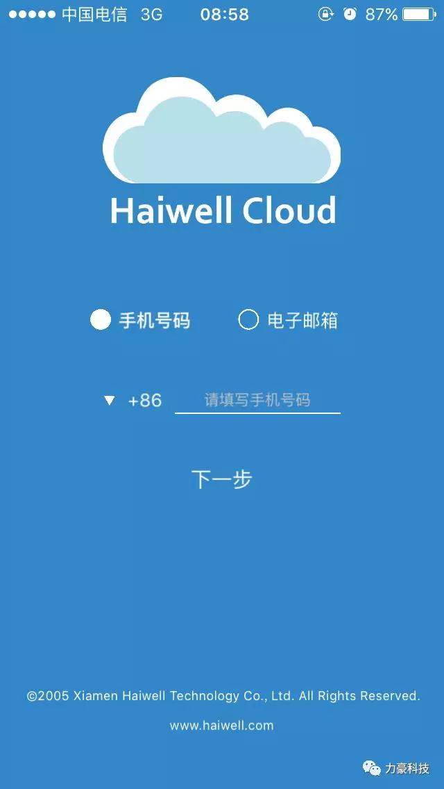 3.1 在手机上下载海为云APP,然后注册账户(可以使用手机号码或邮箱注册)。 注册后登录,您将看到一个模拟演示装置。
