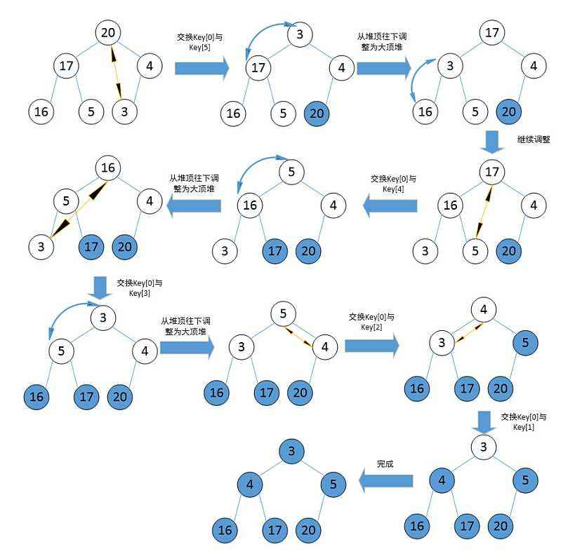 - 接着,重新调用 函数,将剩余元素重新构建成最大堆,排除已排序的部分。AdjustDown