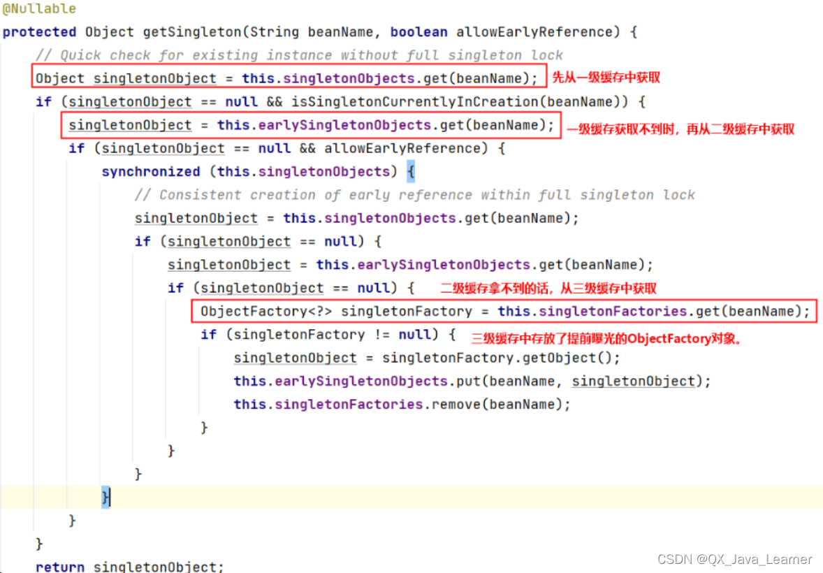 从源码中可以看到,Spring 会先从一级缓存中获取 Bean,如果获取不到,则从二级缓存中获取 Bean,如果二级缓存还是获取不到,则从三级缓存中获取之前曝光的 ObjectFactory 对象,通过 ObjectFactory 对象获取 Bean 实例,这样就解决了循环依赖的问题