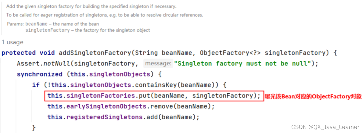 我们再来看,在该类中有这样一个方法addSingletonFactory(),这个方法的作用是:将创建Bean对象的ObjectFactory对象提前曝光