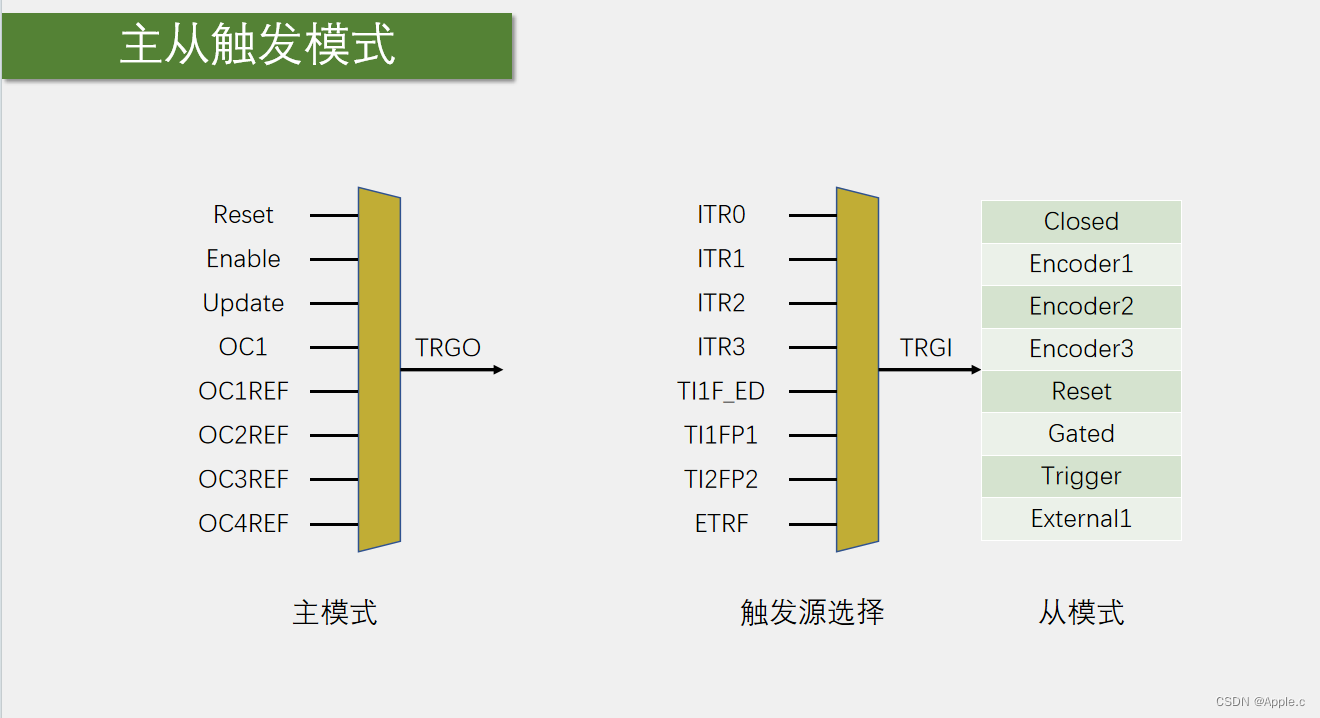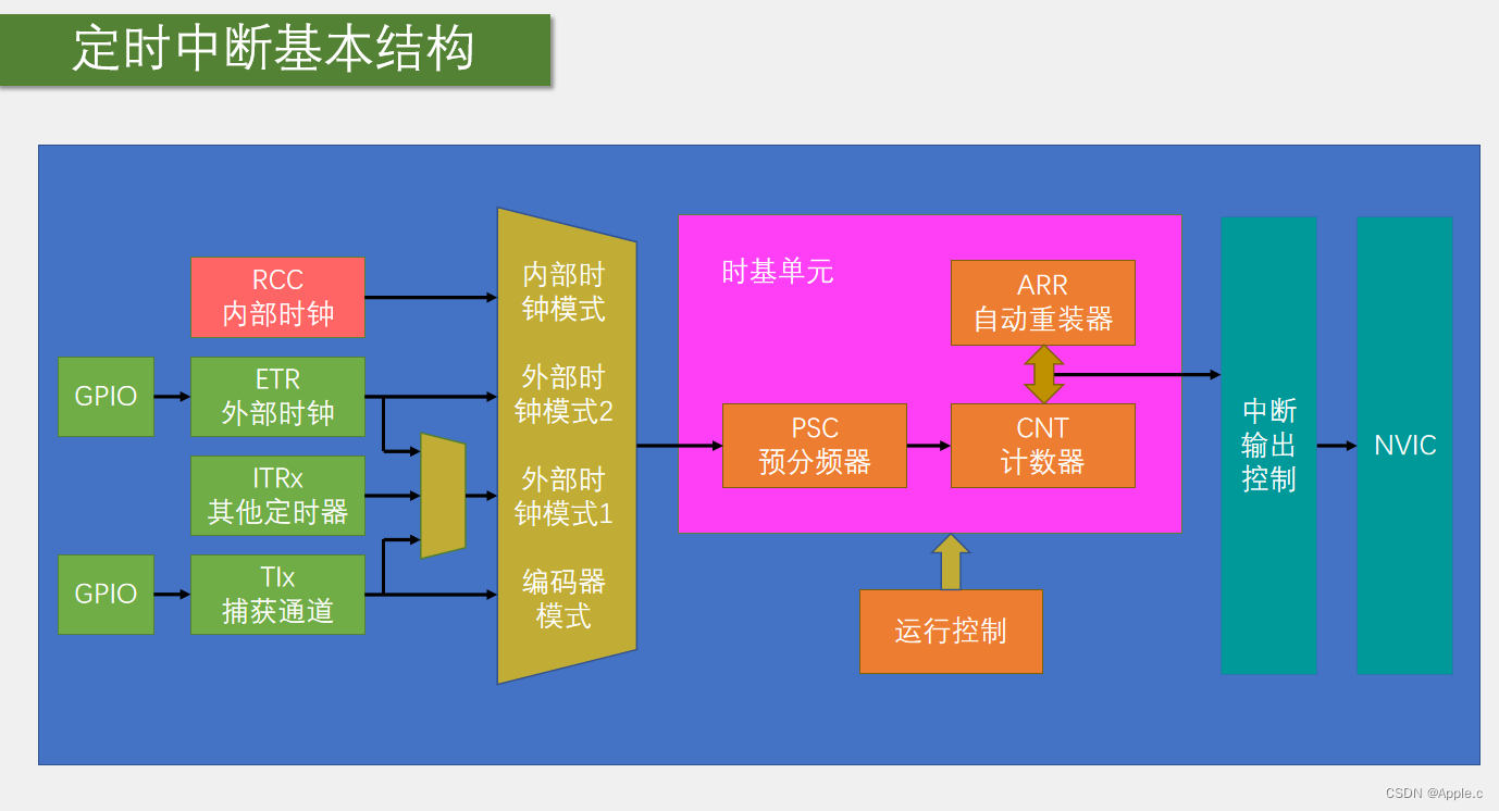 - 不仅具备基本的定时中断功能,而且还包含内外时钟源选择、输入捕获、输出比较、编码器接口、主从触发模式等多种功能