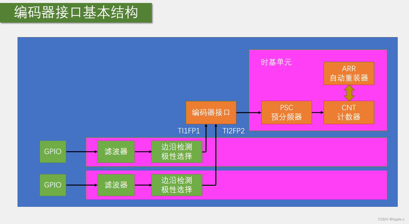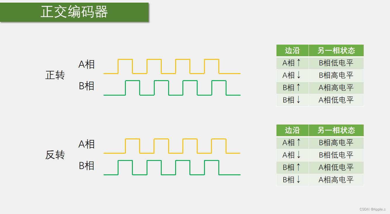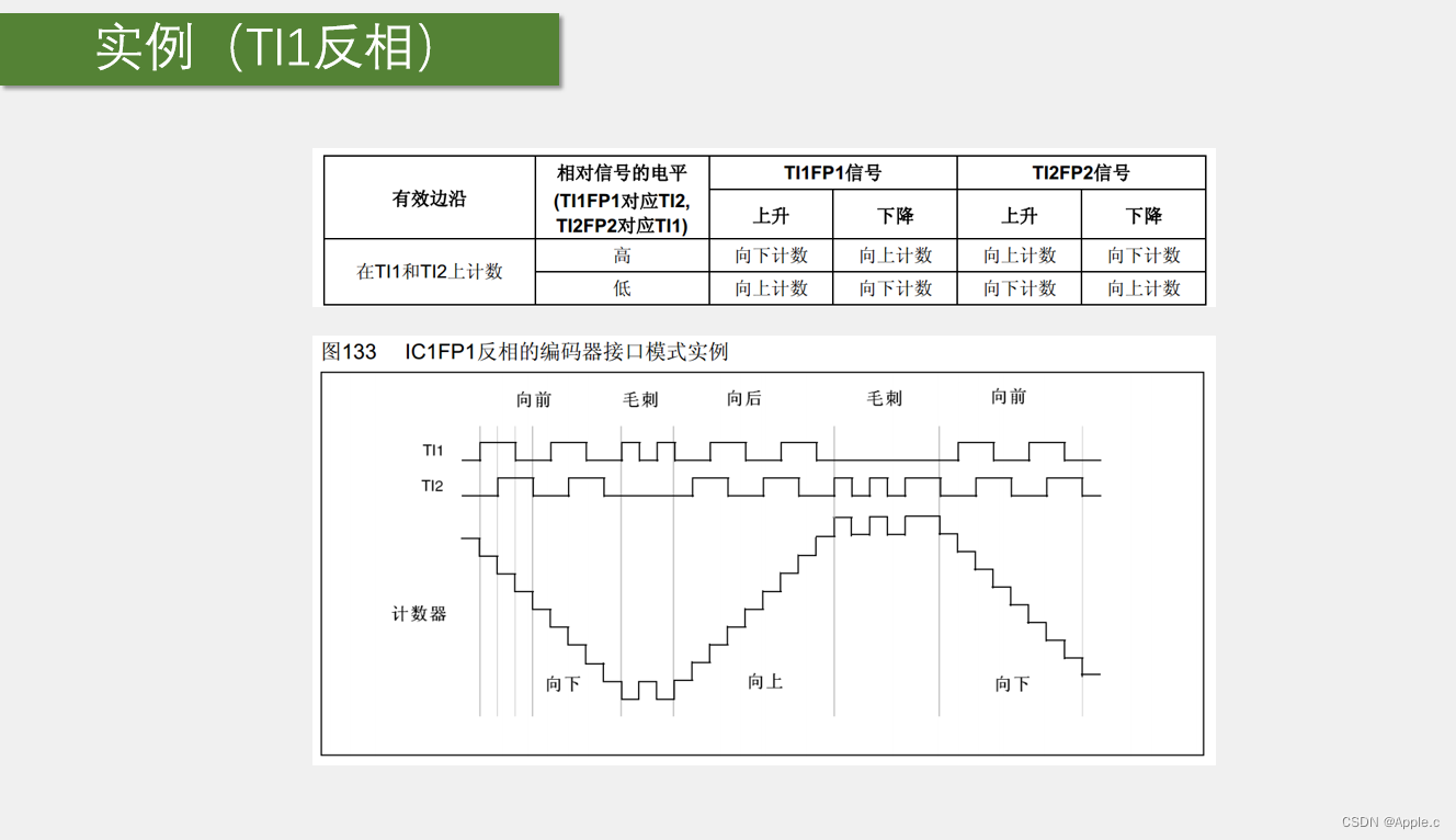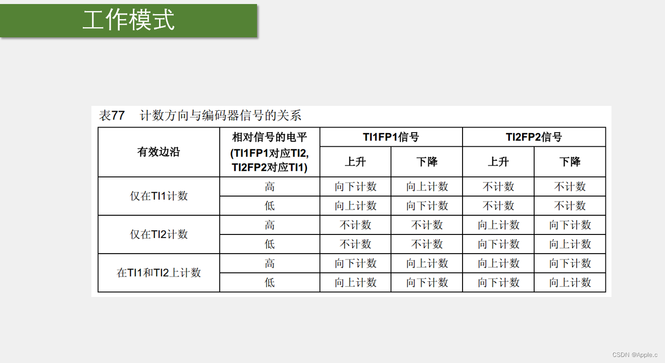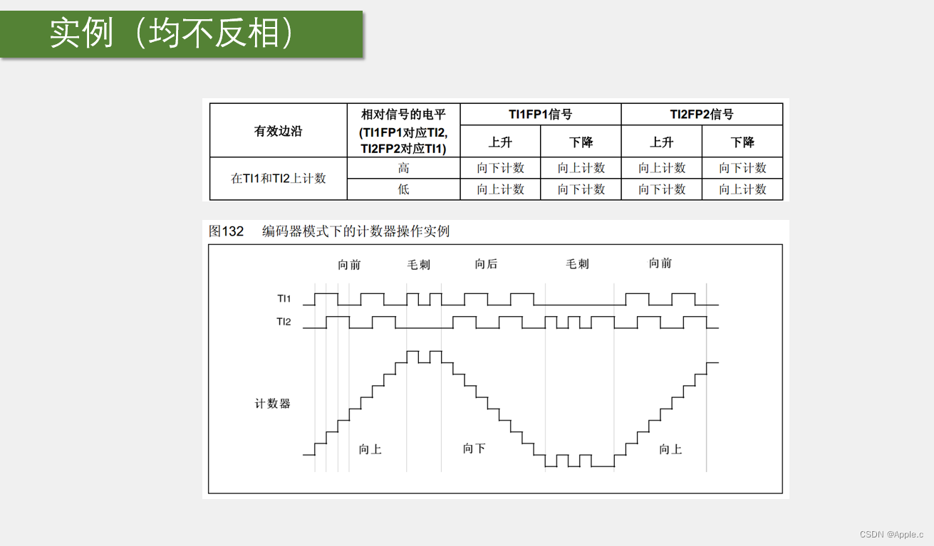 - 编码器接口可接收增量(正交)编码器的信号,根据编码器旋转产生的正交信号脉冲,自动控制CNT自增或自减,从而指示编码器的位置、旋转方向和旋转速度