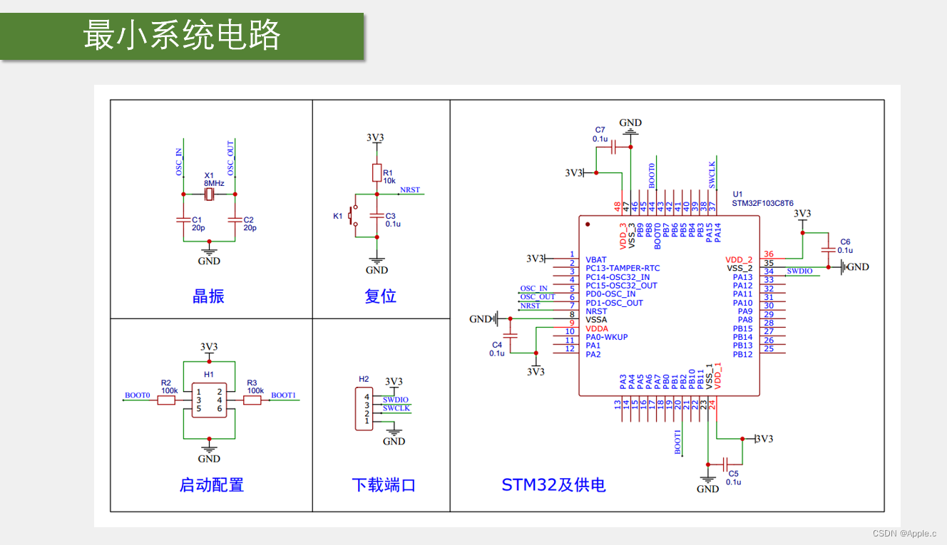 红色是电源相关的引脚,蓝色是最小系统相关的引脚,绿色是I/O功能相关的引脚