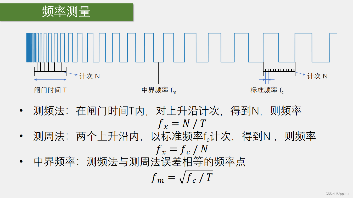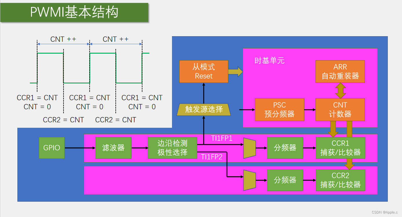 - 输入捕获模式下,当通道输入引脚出现指定电平跳变时,当前CNT的值将被锁存到CCR中,可用于测量PWM波形的频率、占空比、脉冲间隔、电平持续时间等参数
