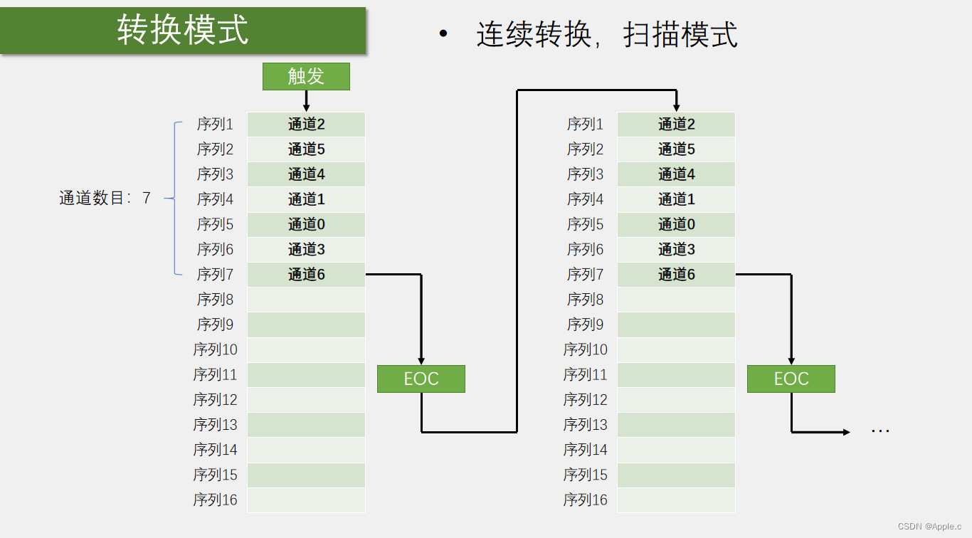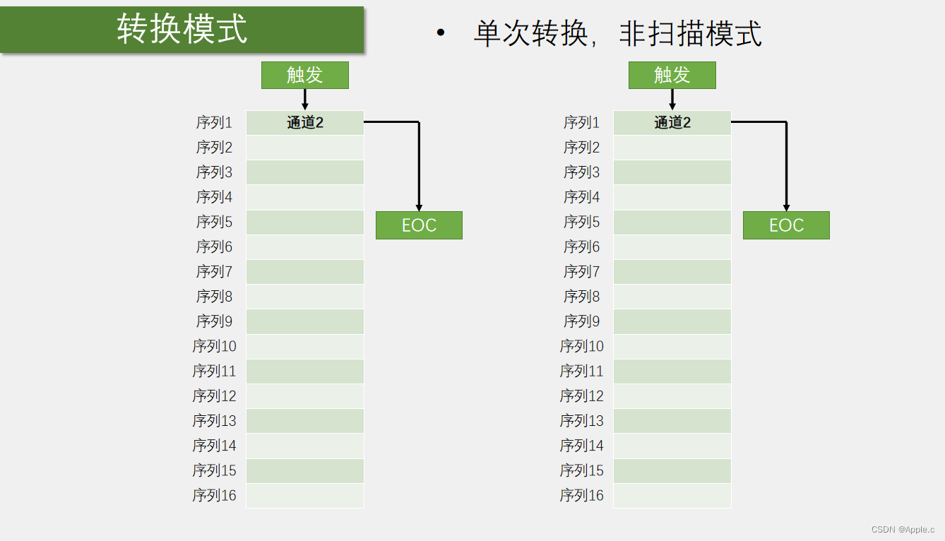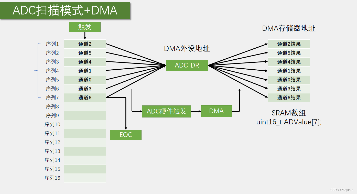 #include "stm32f10x.h" // Device header /** * 函 数:AD初始化 * 参 数:无 * 返 回 值:无 */ void AD_Init(void) { /*开启时钟*/ RCC_APB2PeriphClockCmd(RCC_APB2Periph_ADC1, ENABLE); //开启ADC1的时钟 RCC_APB2PeriphClockCmd(RCC_APB2Periph_GPIOA, ENABLE); //开启GPIOA的时钟 /*设置ADC时钟*/ RCC_ADCCLKConfig(RCC_PCLK2_Div6); //选择时钟6分频,ADCCLK = 72MHz / 6 = 12MHz /*GPIO初始化*/ GPIO_InitTypeDef GPIO_InitStructure; GPIO_InitStructure.GPIO_Mode = GPIO_Mode_AIN; GPIO_InitStructure.GPIO_Pin = GPIO_Pin_0 | GPIO_Pin_1 | GPIO_Pin_2 | GPIO_Pin_3; GPIO_InitStructure.GPIO_Speed = GPIO_Speed_50MHz; GPIO_Init(GPIOA, &GPIO_InitStructure); //将PA0、PA1、PA2和PA3引脚初始化为模拟输入 /*不在此处配置规则组序列,而是在每次AD转换前配置,这样可以灵活更改AD转换的通道*/ /*ADC初始化*/ ADC_InitTypeDef ADC_InitStructure; //定义结构体变量 ADC_InitStructure.ADC_Mode = ADC_Mode_Independent; //模式,选择独立模式,即单独使用ADC1 ADC_InitStructure.ADC_DataAlign = ADC_DataAlign_Right; //数据对齐,选择右对齐 ADC_InitStructure.ADC_ExternalTrigConv = ADC_ExternalTrigConv_None; //外部触发,使用软件触发,不需要外部触发 ADC_InitStructure.ADC_ContinuousConvMode = DISABLE; //连续转换,失能,每转换一次规则组序列后停止 ADC_InitStructure.ADC_ScanConvMode = DISABLE; //扫描模式,失能,只转换规则组的序列1这一个位置 ADC_InitStructure.ADC_NbrOfChannel = 1; //通道数,为1,仅在扫描模式下,才需要指定大于1的数,在非扫描模式下,只能是1 ADC_Init(ADC1, &ADC_InitStructure); //将结构体变量交给ADC_Init,配置ADC1 /*ADC使能*/ ADC_Cmd(ADC1, ENABLE); //使能ADC1,ADC开始运行 /*ADC校准*/ ADC_ResetCalibration(ADC1); //固定流程,内部有电路会自动执行校准 while (ADC_GetResetCalibrationStatus(ADC1) == SET); ADC_StartCalibration(ADC1); while (ADC_GetCalibrationStatus(ADC1) == SET); } /** * 函 数:获取AD转换的值 * 参 数:ADC_Channel 指定AD转换的通道,范围:ADC_Channel_x,其中x可以是0/1/2/3 * 返 回 值:AD转换的值,范围:0~4095 */ uint16_t AD_GetValue(uint8_t ADC_Channel) { ADC_RegularChannelConfig(ADC1, ADC_Channel, 1, ADC_SampleTime_55Cycles5); //在每次转换前,根据函数形参灵活更改规则组的通道1 ADC_SoftwareStartConvCmd(ADC1, ENABLE); //软件触发AD转换一次 while (ADC_GetFlagStatus(ADC1, ADC_FLAG_EOC) == RESET); //等待EOC标志位,即等待AD转换结束 return ADC_GetConversionValue(ADC1); //读数据寄存器,得到AD转换的结果 }十四、DMA直接存储器存取
