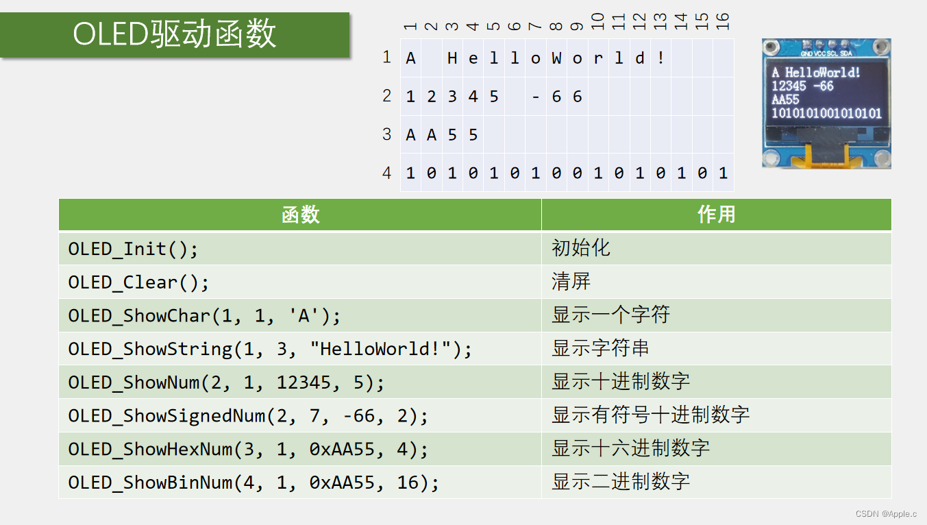 #include "stm32f10x.h" // Device header #include "Delay.h" #include "OLED.h" int main(void) { /*模块初始化*/ OLED_Init(); //OLED初始化 /*OLED显示*/ OLED_ShowChar(1, 1, 'A'); //1行1列显示字符A OLED_ShowString(1, 3, "HelloWorld!"); //1行3列显示字符串HelloWorld! OLED_ShowNum(2, 1, 12345, 5); //2行1列显示十进制数字12345,长度为5 OLED_ShowSignedNum(2, 7, -66, 2); //2行7列显示有符号十进制数字-66,长度为2 OLED_ShowHexNum(3, 1, 0xAA55, 4); //3行1列显示十六进制数字0xA5A5,长度为4 OLED_ShowBinNum(4, 1, 0xAA55, 16); //4行1列显示二进制数字0xA5A5,长度为16 //C语言无法直接写出二进制数字,故需要用十六进制表示 while (1) { } }OLED.C