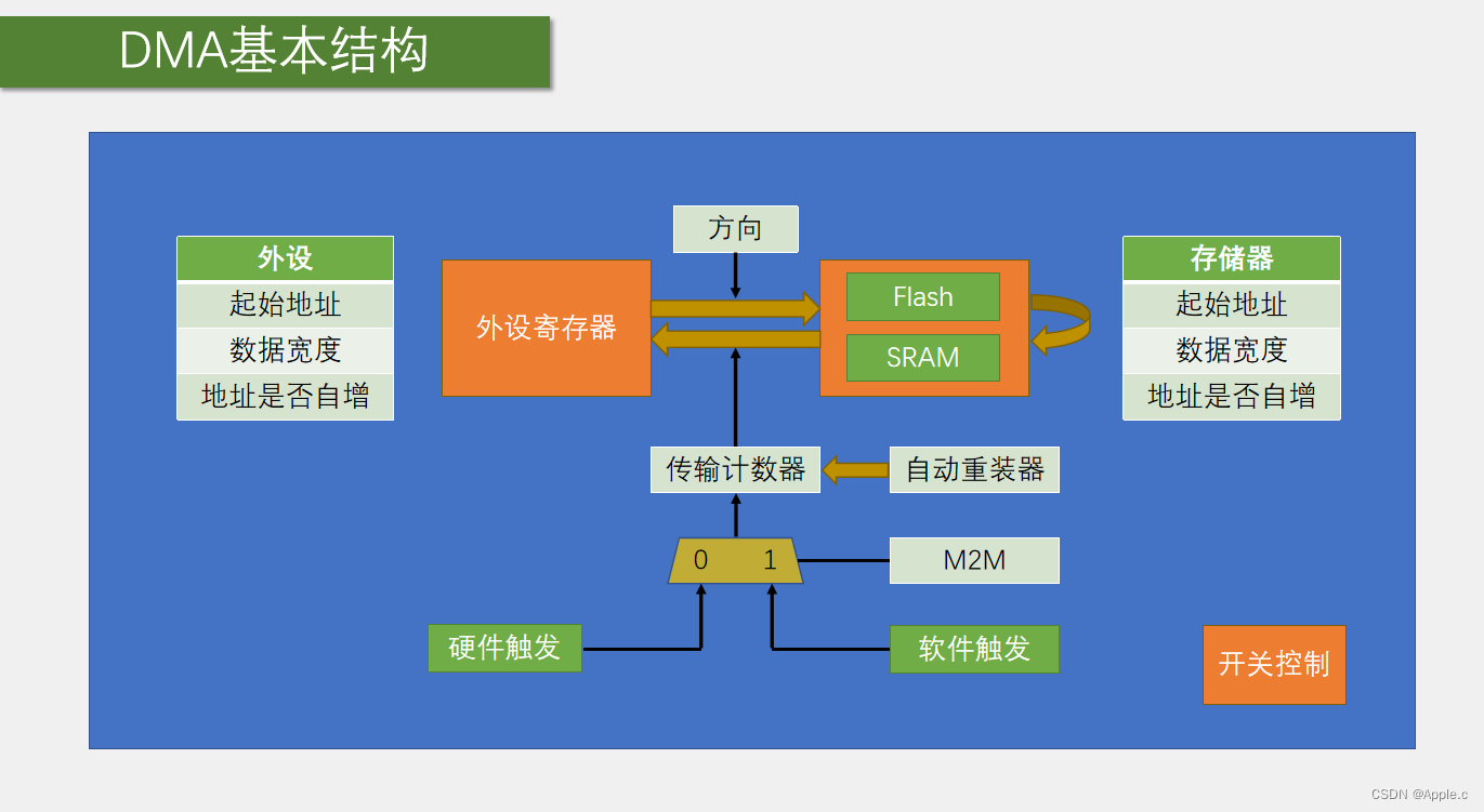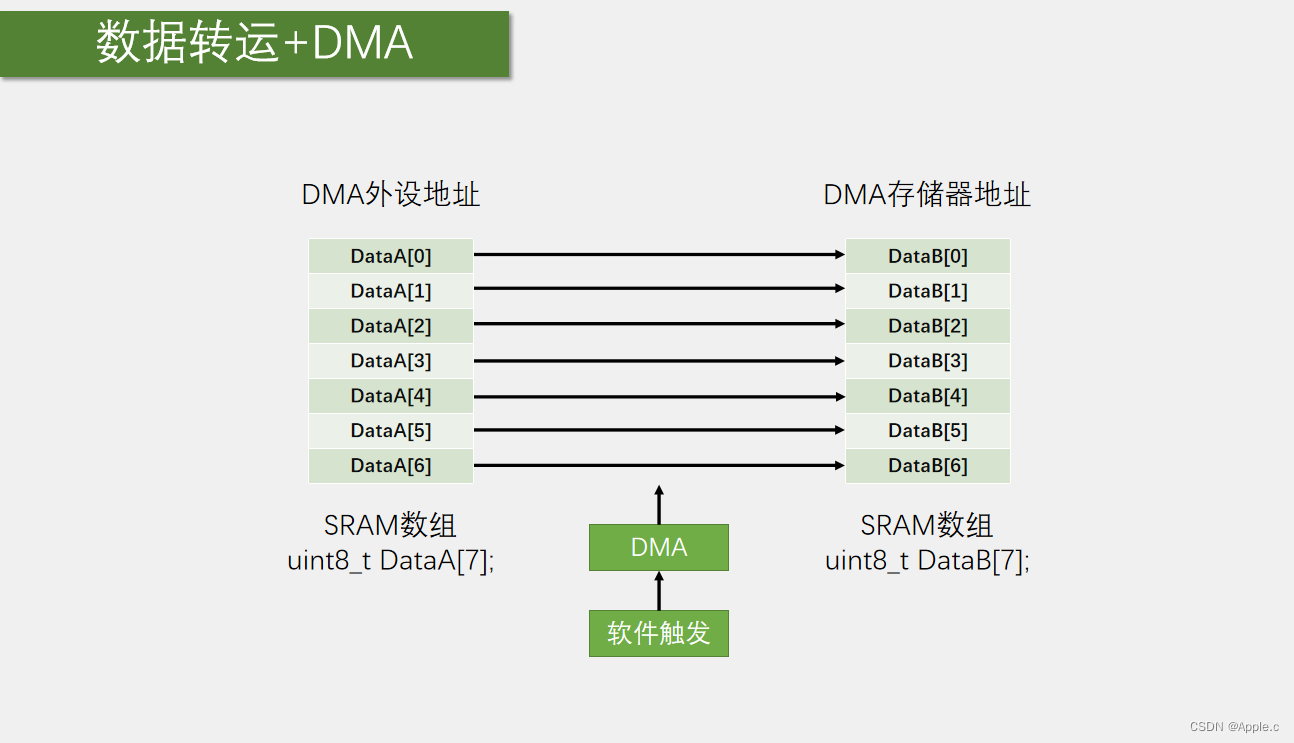 - DMA可以提供外设和存储器或者存储器和存储器之间的高速数据传输,无须CPU干预,节省了CPU的资源