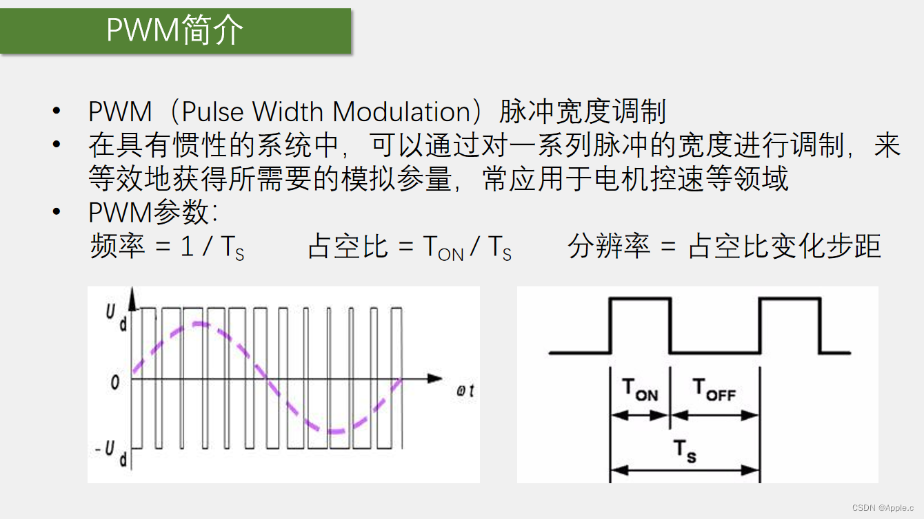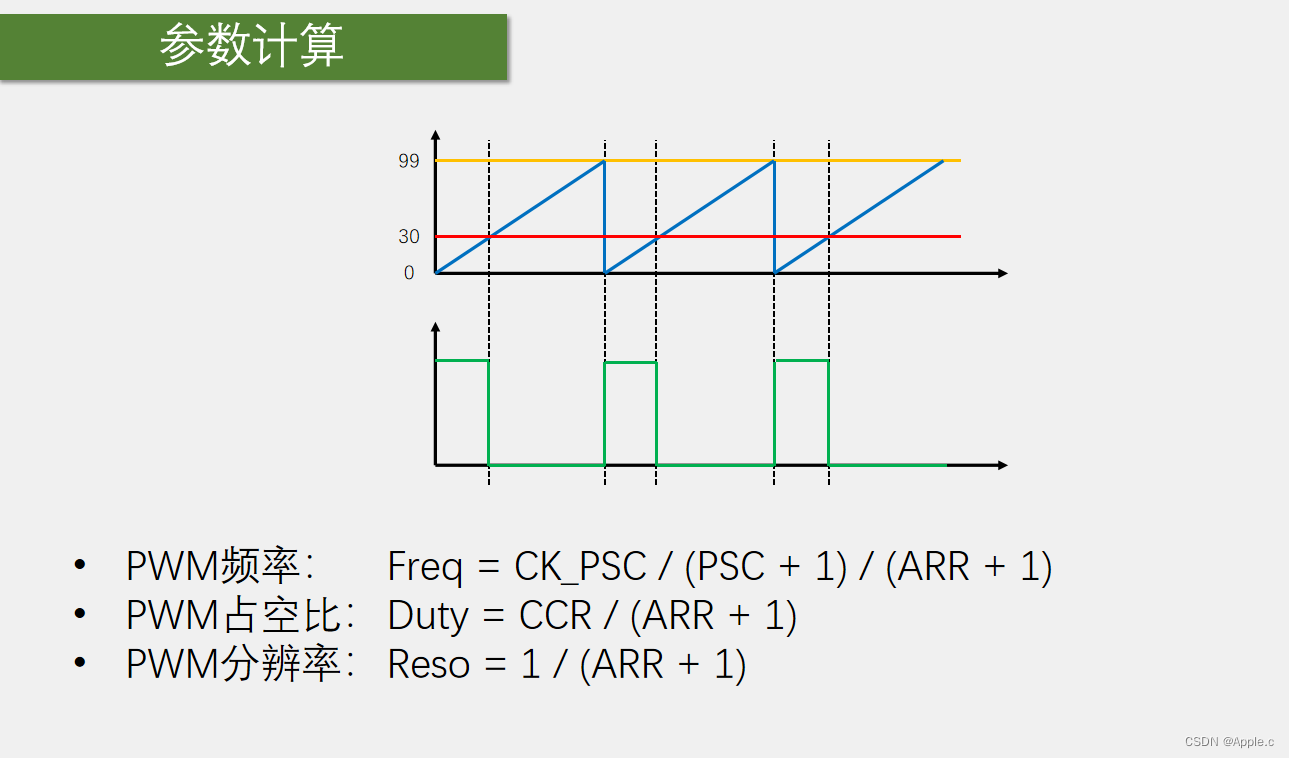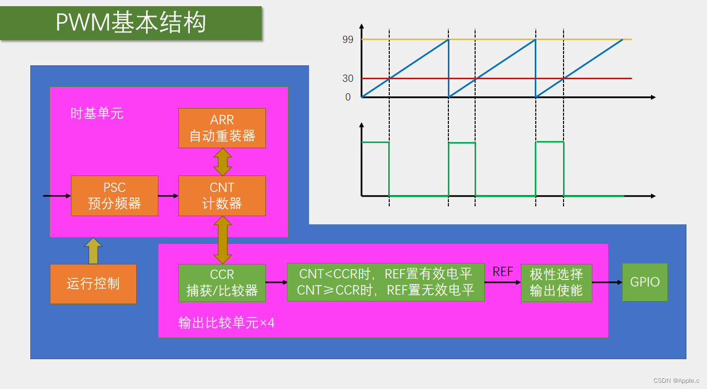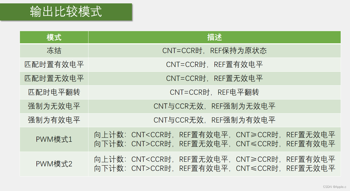 - 输出比较可以通过比较CNT与CCR寄存器值的关系,来对输出电平进行置1、置0或翻转的操作,用于输出一定频率和占空比的PWM波形
