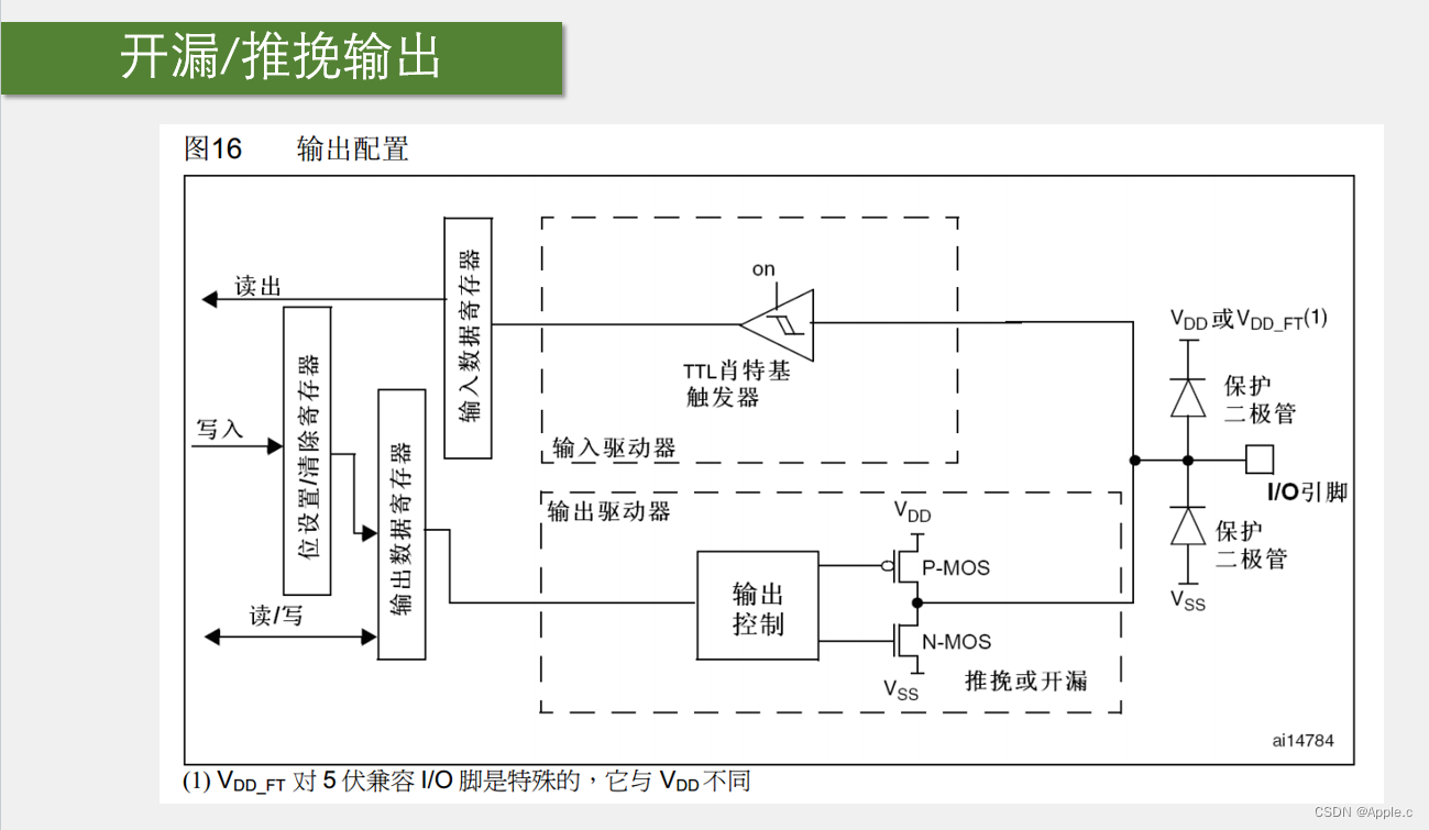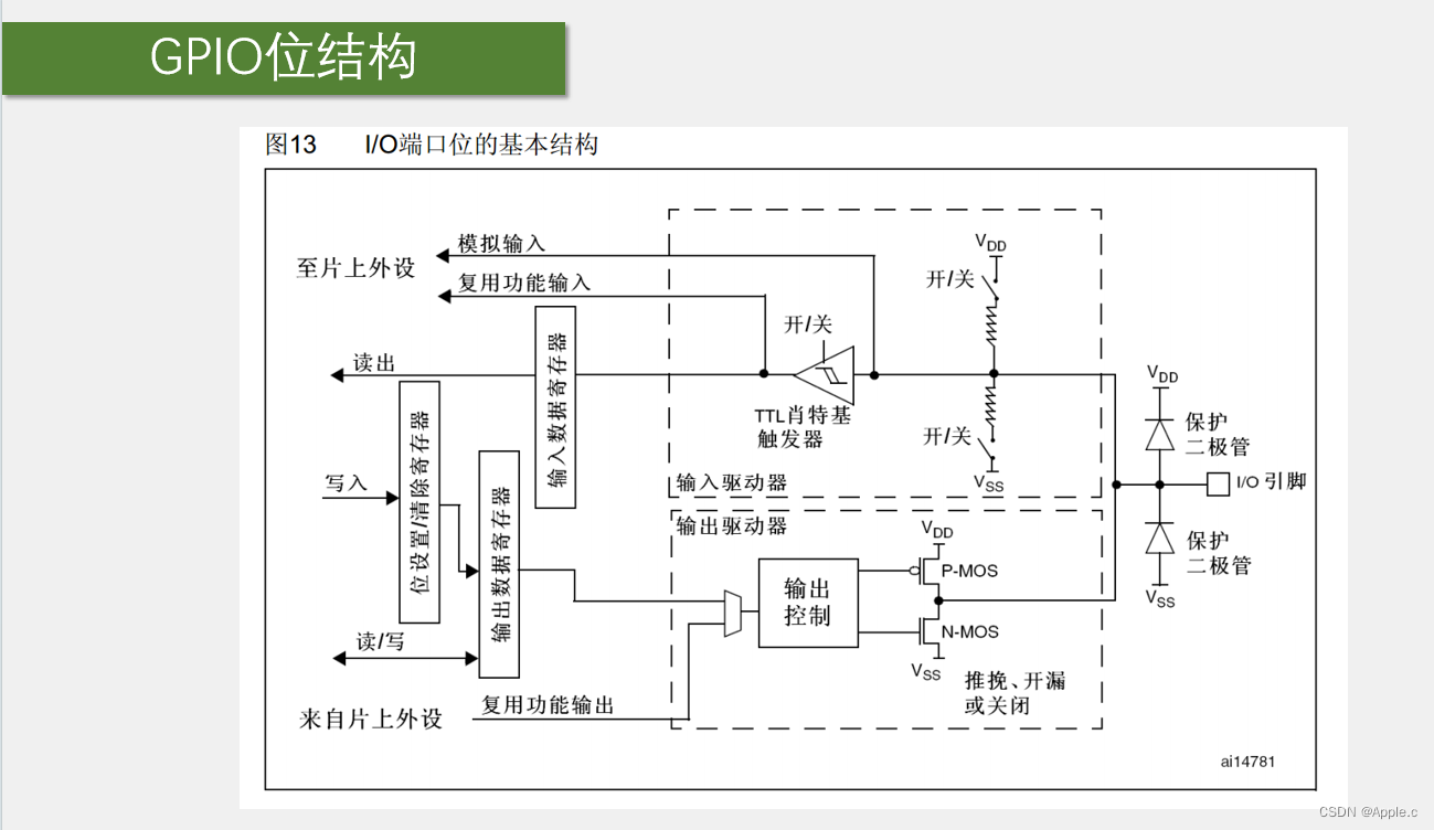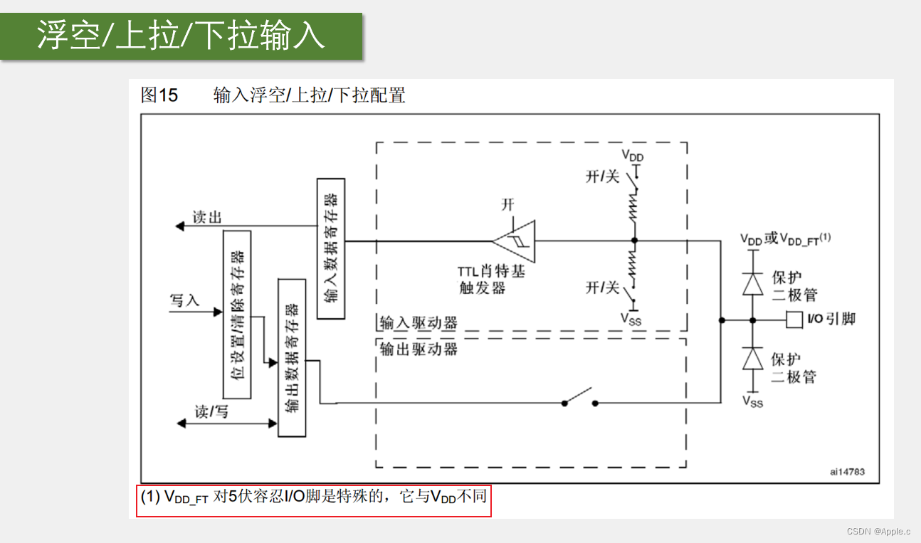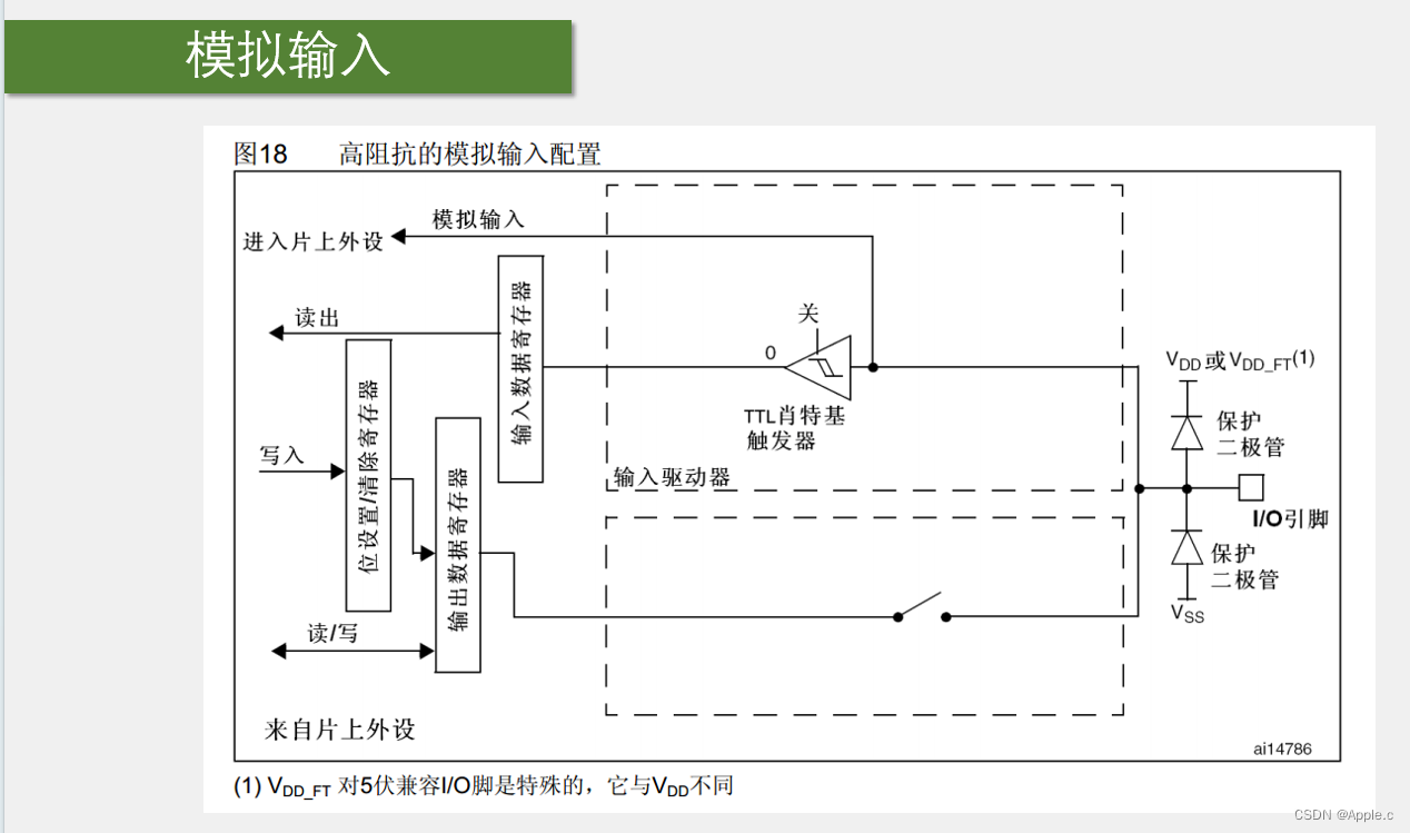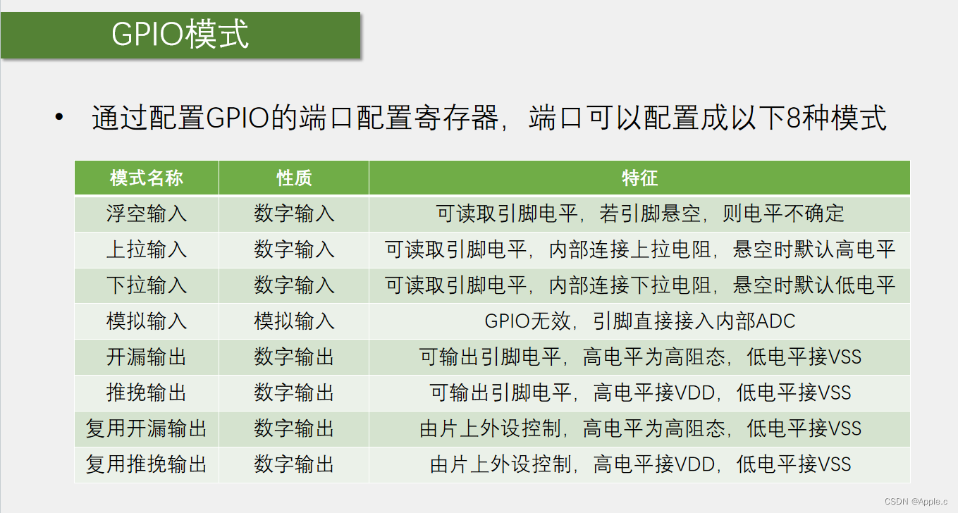 - 输入模式下可读取端口的高低电平或电压,用于读取按键输入、外接模块电平信号输入、ADC电 压采集、模拟通信协议接收数据等