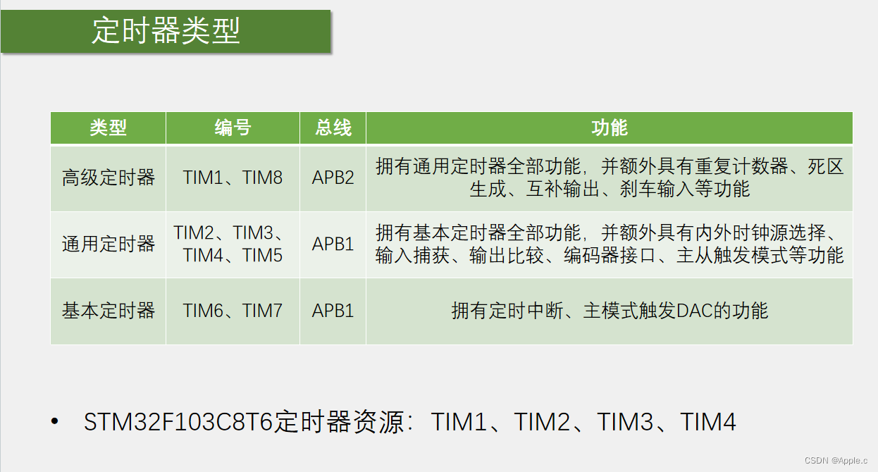 - 根据复杂度和应用场景分为了高级定时器、通用定时器、基本定时器三种类型