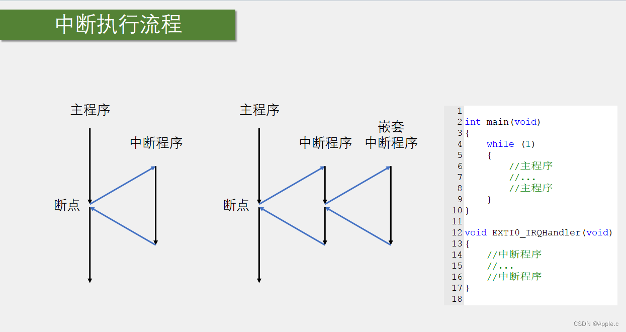 - 中断嵌套:当一个中断程序正在运行时,又有新的更高优先级的中断源申请中断,CPU再次暂停当前中断程序,转而去处理新的中断程序,处理完成后依次进行返回