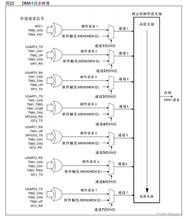 - STM32F103C8T6 DMA资源:DMA1(7个通道)