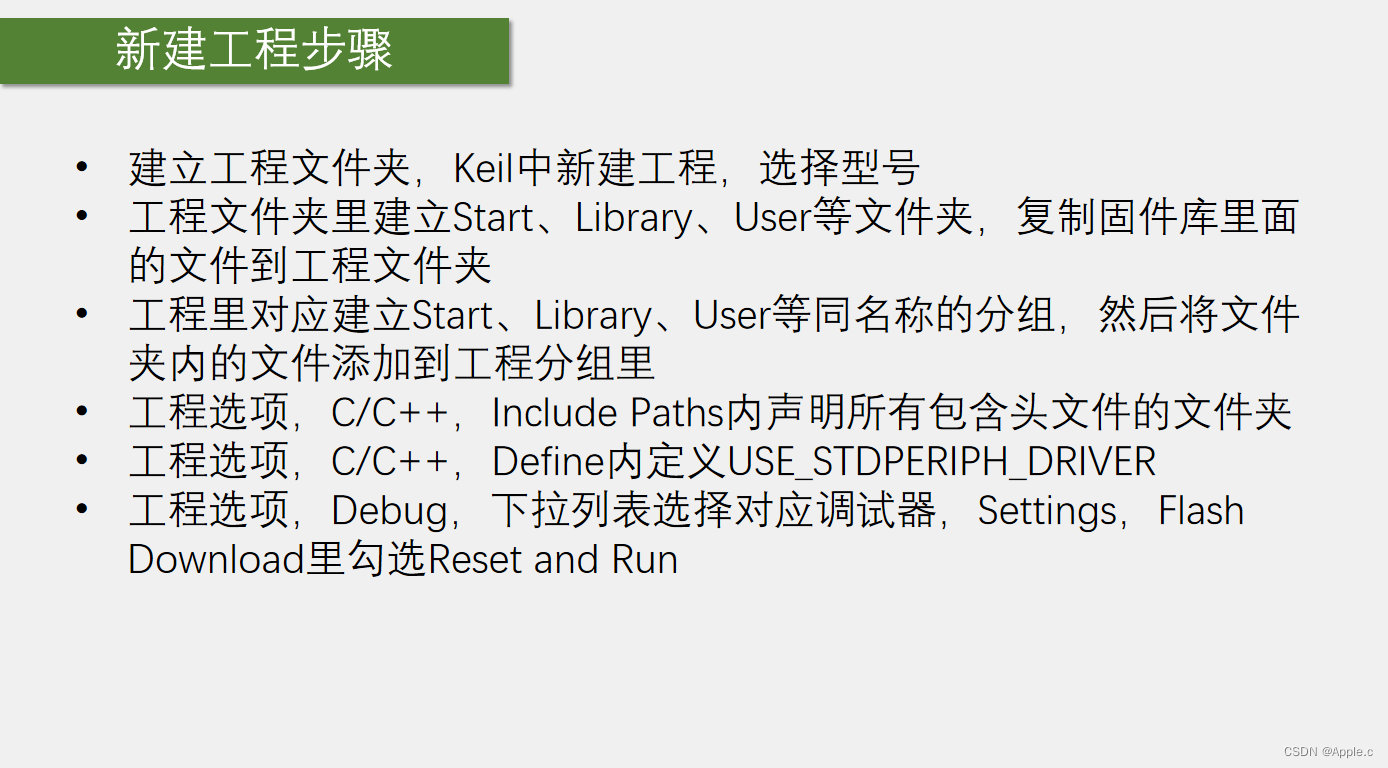添加工程必要文件:打开Libraries->CMSIS -> CM3-> DeviceSupport-> ST-> STM32F10x-> startup-> arm->文件为启动文件,全选复制到工程模板文件夹(新建Start文件夹),回到STM32F10x(复制那三个文件stmxxx.h、systemxxx.c、systemxxx.h)复制到Start文件夹,接着打开CM3->CoreSupport(两个文件复制到Start文件夹),然后回到Keil软件将文件添加到工程里->将Source Group1单击改名Start->右键Start选择添加已存在文件,打开Start文件夹,打开文件过滤器选择All files,添加启动文件(视频里所用型号为添加后缀md.s的启动文件)和剩下所有.c和.h文件->最后在工程选项里添加该文件夹头文件路径 魔术棒按钮->C/C++->Include Paths点右边三个点按钮然后新建路径再点右三个点按钮添加Start路径,最后点ok ->打开新建工程文件夹添加新文件夹User(放main函数),然后点keil里Target右键添加组 改名User右击添加文件选.c命名为main(注意路径选择User文件夹),在main里右键插入头文件stm32f10x.h,写上主函数,最后一行必须为空行,至此就完成了工程建立(基于寄存器开发)keil软件扳手按钮里Encoding->UTF-8可以防止中文乱码