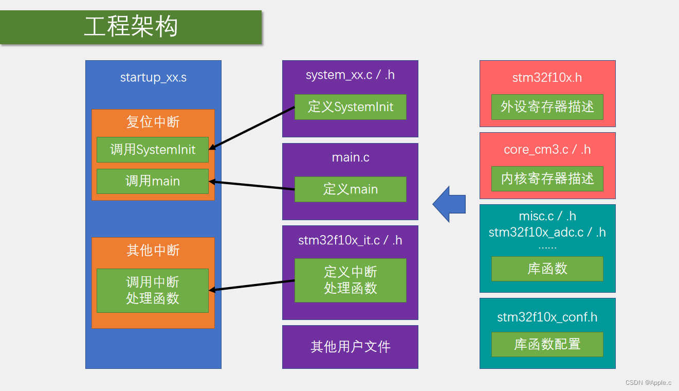 类型 起始地址 存储器 用途 ROM 0x0800 0000 程序存储器Flash 存储C语言编译后的程序代码 0x1FFF F000 系统存储器 存储BootLoader,用于串口下载 0x1FFF F800 选项字节 存储一些独立于程序代码的配置参数 RAM 0x2000 0000 运行内存SRAM 存储运行过程中的临时变量 0x4000 0000 外设寄存器 存储各个外设的配置参数 0xE000 0000 内核外设寄存器 存储内核各个外设的配置参数 代码示例