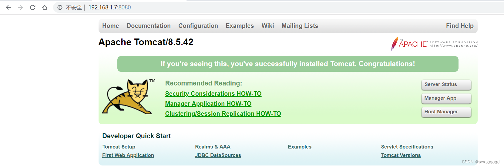[root@java-tomcat1 bin]# tailf /data/application/tomcat/logs/catalina.out org.apache.catalina.startup.HostConfig.deployDirectory Deployment of web application directory [/data/application/tomcat/webapps/host-manager] has finished in [21] ms 04-Jul-2019 22:40:00.026 INFO [localhost-startStop-1] org.apache.catalina.startup.HostConfig.deployDirectory Deploying web application directory [/data/application/tomcat/webapps/manager] 04-Jul-2019 22:40:00.042 INFO [localhost-startStop-1] org.apache.catalina.startup.HostConfig.deployDirectory Deployment of web application directory [/data/application/tomcat/webapps/manager] has finished in [16] ms 04-Jul-2019 22:40:00.048 INFO [main] org.apache.coyote.AbstractProtocol.start Starting ProtocolHandler ["http-nio-8080"] 04-Jul-2019 22:40:00.058 INFO [main] org.apache.coyote.AbstractProtocol.start Starting ProtocolHandler ["ajp-nio-8009"] 04-Jul-2019 22:40:00.062 INFO [main] org.apache.catalina.startup.Catalina.start Server startup in 479 ms