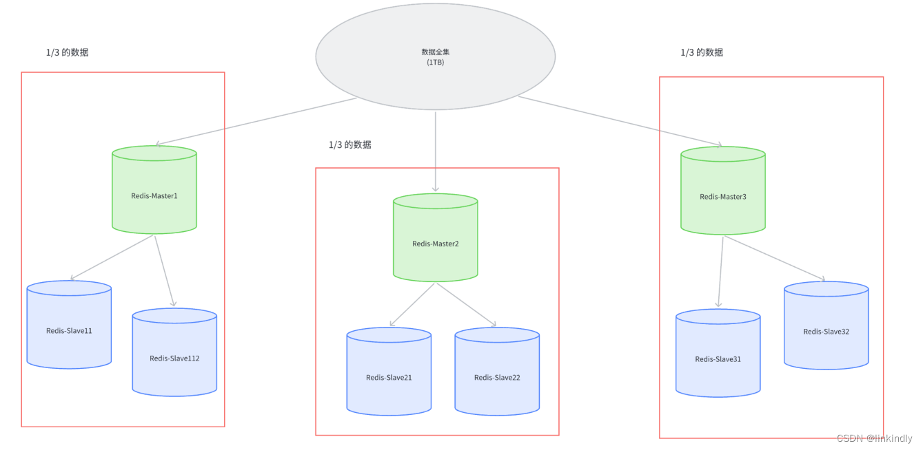 假定整个数据全集是1TB,引入三组Master / Slave来存储.那么每一组机器只需要存储整个数据全集的1/3即可.