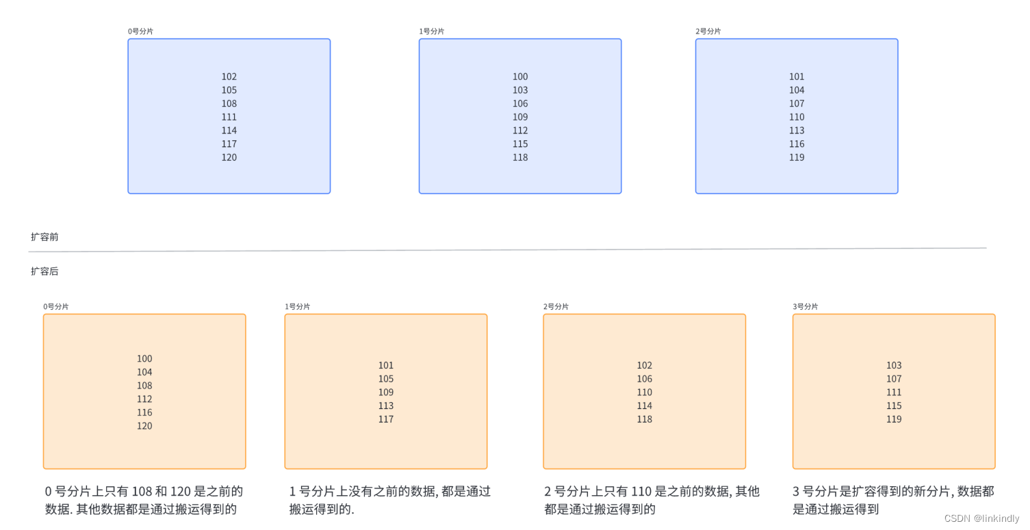 此时,只需要把0号分片.上的部分数据,搬运给3号分片即可.1号分片和2号分片管理的区间都是不变