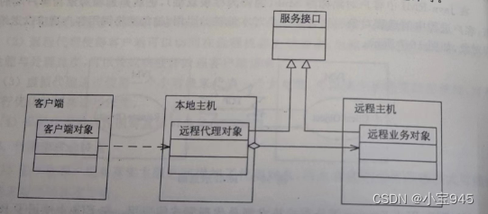 - 远程代理可以将网络的细节隐藏起来,使得客户端不必考虑网络的存在。客户完全可以认为被代理的远程业务对象是局域的而不是远程的,而远程代理对象承担了大部分的网络通信工作。远程代理模式如下图,客户端对象不能直接直接访问远程主机中的业务对象,只能通过本地主机间接访问,远程业务对象在本地主机中有一个远程代理对象,它负责对远程业务对象的访问和网络通信,对于客户端而言是透明的,客户端无需关心实现具体业务的是谁,它只需要按照服务接口所定义的方式直接与本地主机交互即可。