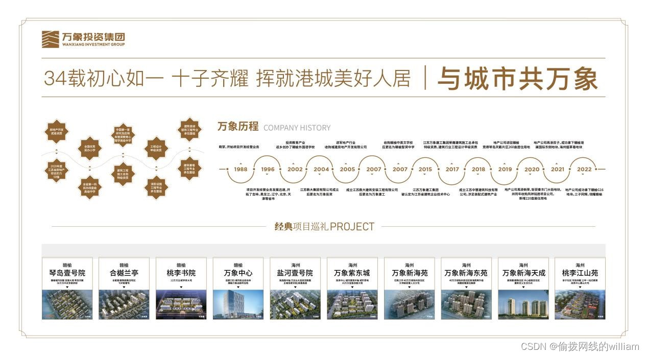 万向投资集团跻身江苏省综合性房地产企业50强。 已有34年的历史。 不仅具有建筑施工总承包特级资质,而且集建筑、教育、房地产、企业管理、物业管理于一体。 是一家投资高效、经营稳健的本土投资集团。 已成功开发金华园、农松商业超市、凤凰国际大厦、花园小区、万象新海花园、万象新海花园东花园、万象新海天成、万象紫东城、万象琴岛一号院、万象中心、禾悦兰亭。 、桃李书院、沿河一号院等众多知名项目。