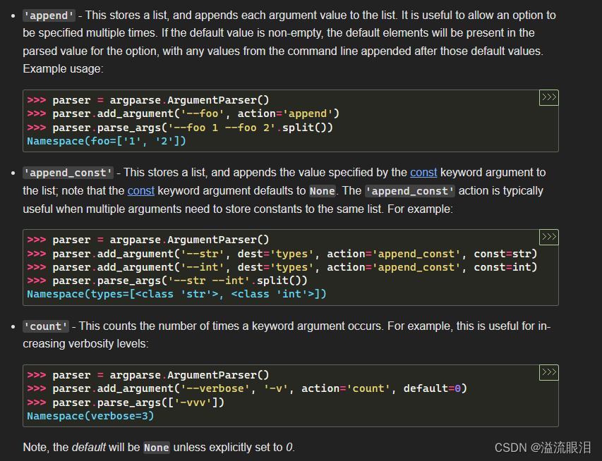 - action='apend' 的话,那么设定该参数是一个列表,我就可以提供多次该参数值,比如这里 --foo 1 --foo 2,那么 foo=['1','2'] 的列表了