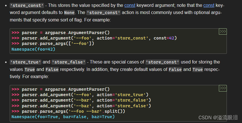 如果设置 action='store_const',那么使用 const=xxx 来设置存储的常数。这样调用 --foo 的话,最终foo=42,不然 foo=None