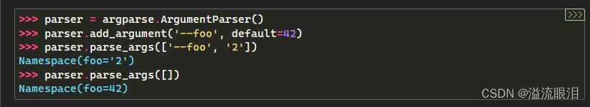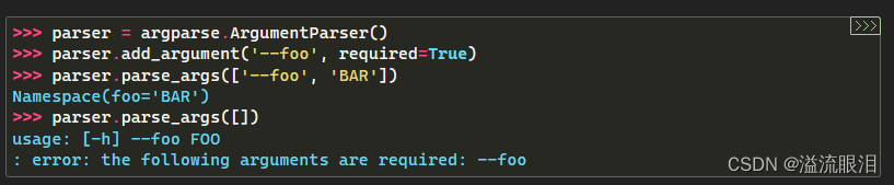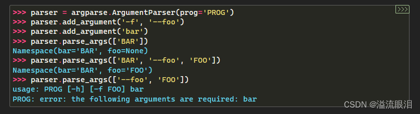 第二个提供了 ['BAR', '--foo', 'FOO'],第一个为位置参数,所以有 bar='BAR' 第二个选项参数 --foo 设置为 FOO