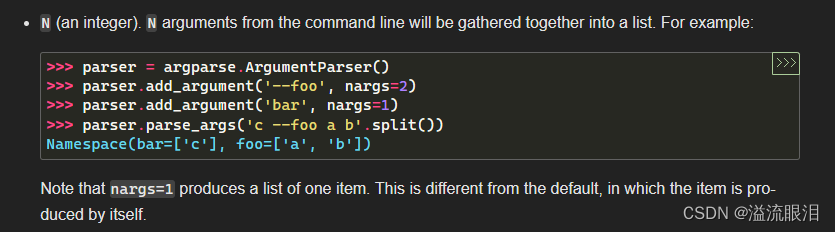 比如 ('--foo', nargs=2),表示 --foo 后面需要接受俩参数,即 --foo a b