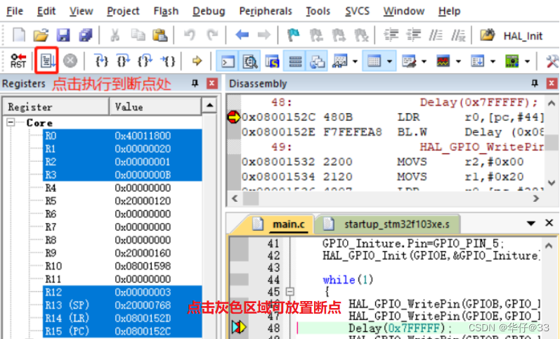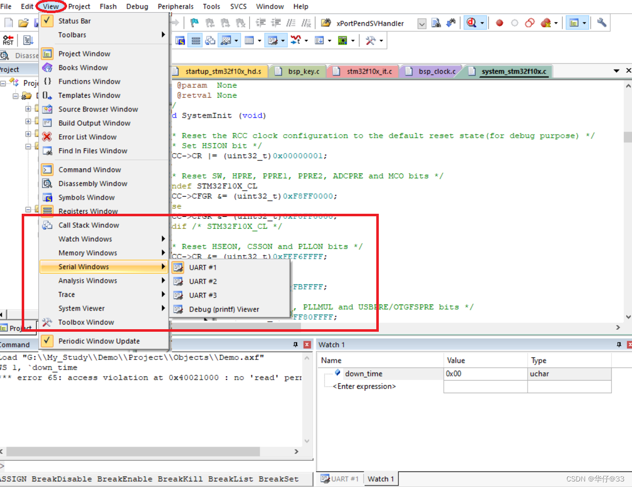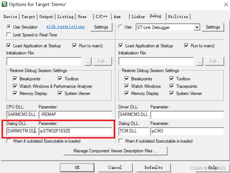 3、如果使用在线模拟仿真调试程序时,出现类似报错“error 65: access violation at 0x40021000 : no 'write' permission”,可以点击魔术棒->Debug界面,进行配置下面的Dialog与Parameter参数,Dialog修改成DARMSTM.DLL,Parameter修改成-pSTM32F103ZE(具体根据芯片型号)