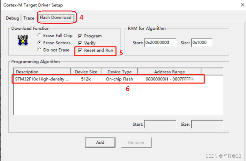 配置完Debug界面后,点击“4-Flash Download”进入如下界面;“5-Reset and Run”可选可不选,就是在点Debug时的一个复位和运行,其他的选项也可根据个人需求进行选择,“6”处则需要根据具体的芯片Flash大小进行选择,比如stm32f103zet6是512K,则需要选择512K的,选其他的话即使程序烧录了也不能调试。