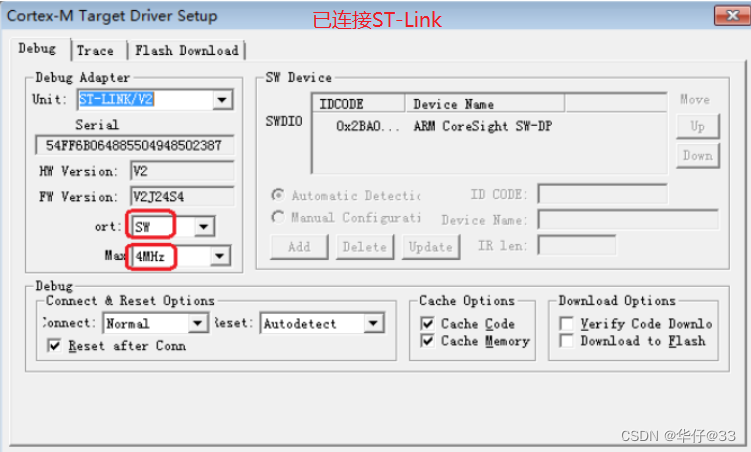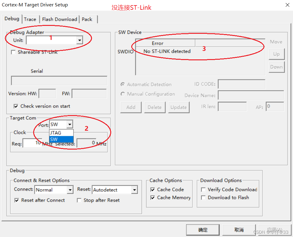 如果点击调试时,出现“No ST-Link detected”提示窗口时,可以点击魔术棒->Debug->Settings查看ST-Link的具体连接状态