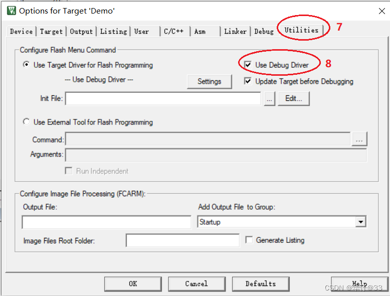 以上配置完之后点击确定,然后点击“7-Utilities”进入如下界面,然后勾选“8-Use Debug Driver”,然后点击OK。至此,ST-Link配置完成。