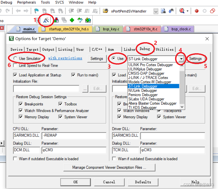 双击打开Keil,选择“1-魔术棒”,弹出界面后,选择“2-Debug”,然后选择“3-User”,点击4的下拉菜单,找到且选择“ST-Link Debugger”(如果是其他型号的烧录器,则根据烧录器型号选择,比如:J-LINK/J-TRACE Cortex),然后点击“5-Settings”。如果选择的是“6-Use Simulator”,则是在线模拟仿真,不需要连接到开发板。
