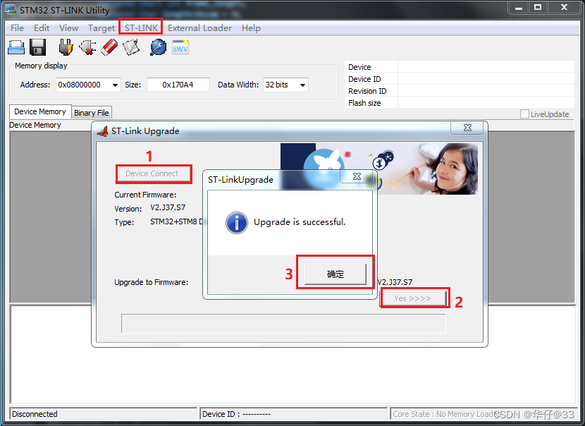 2、如果出现“ST-Link USB communication error”ST-Link USB通信错误,则需要启动STM32 ST-LINK Utility,点击【ST-LINK】->【Firmaware】更新固件,然后打开Kei,点击魔术棒->->Debug->Settings,开到出现类似“0x2BA0 . . . ARM CoreSight SW-DP”显示,说明连接成功