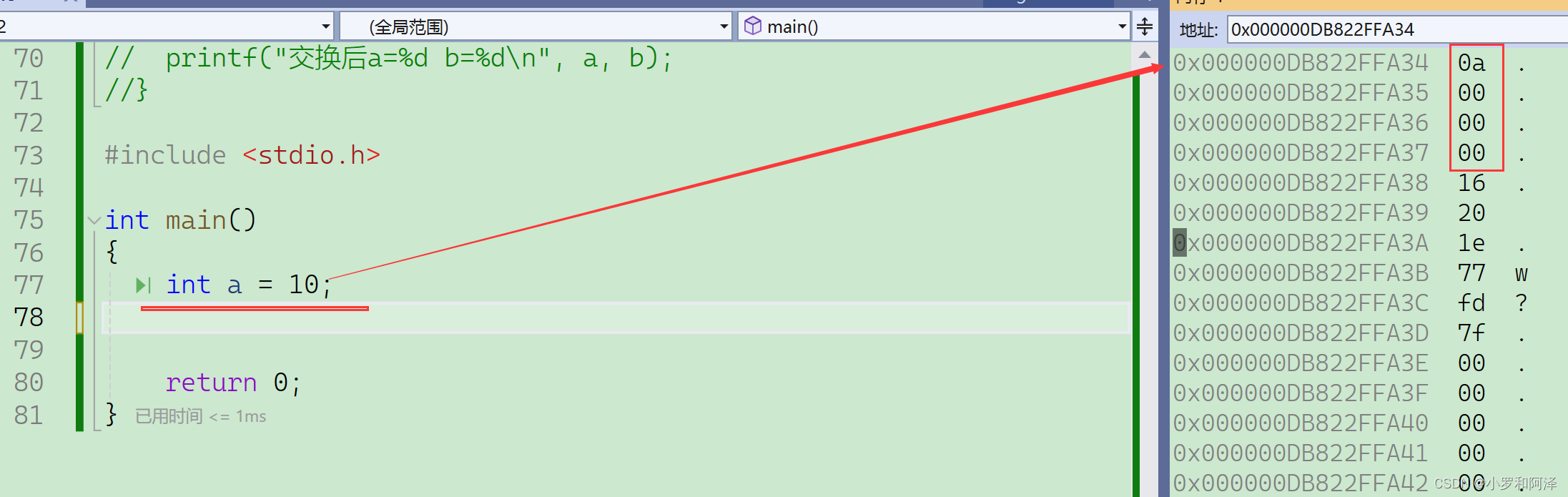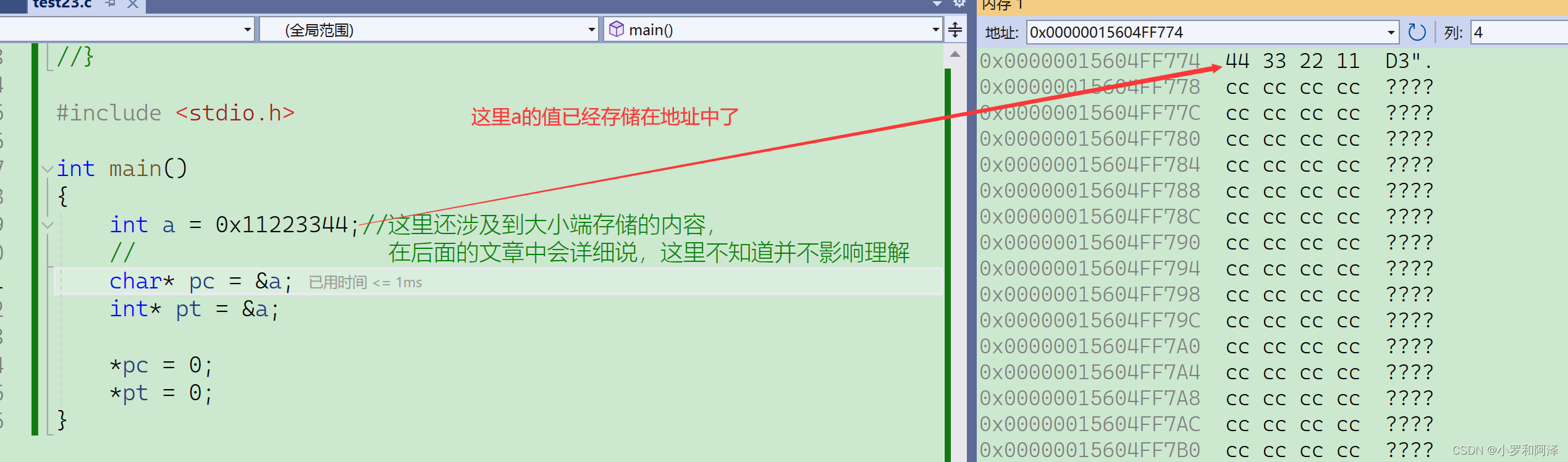 虽然&a得到的是a的第一个地址,但a是int类型占四个字节,所有我们可以顺着思路往下推,就能得到a的所有字节的地址。