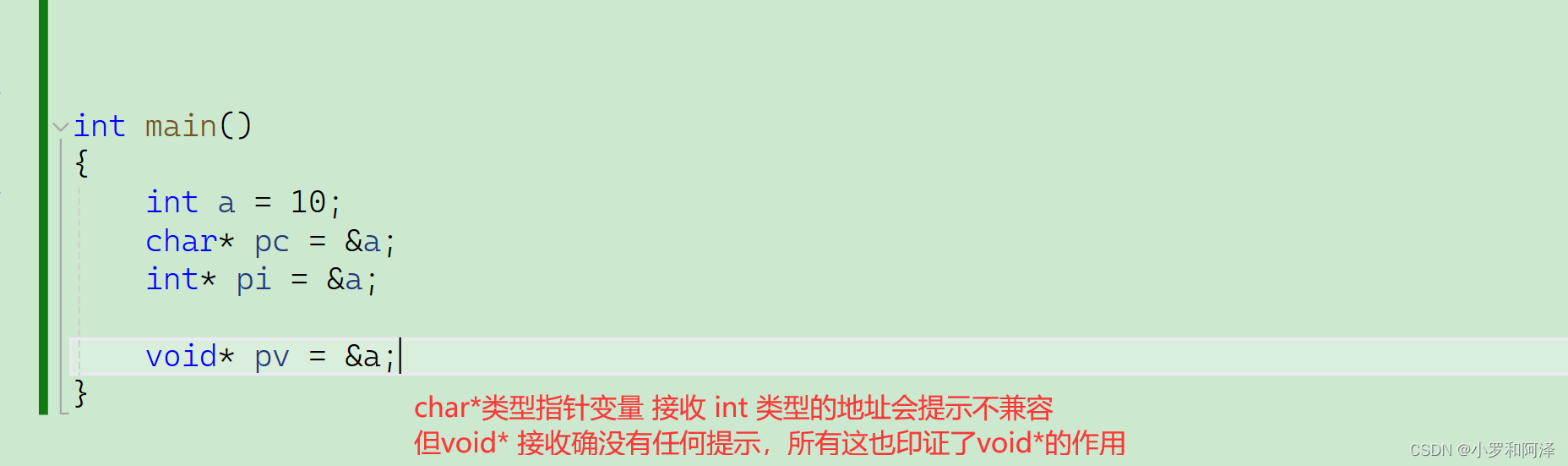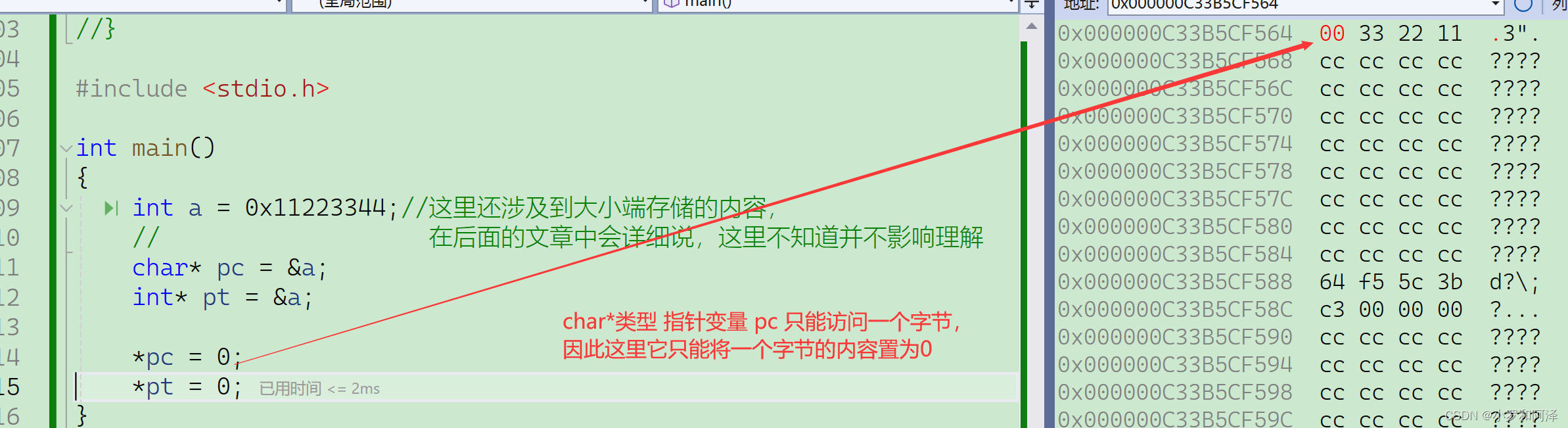 指针类型的作用在解应用的时候,就体现出来了,char*类型解引用时只能访问一个字节,而int*类型解引用可以访问4个字节。