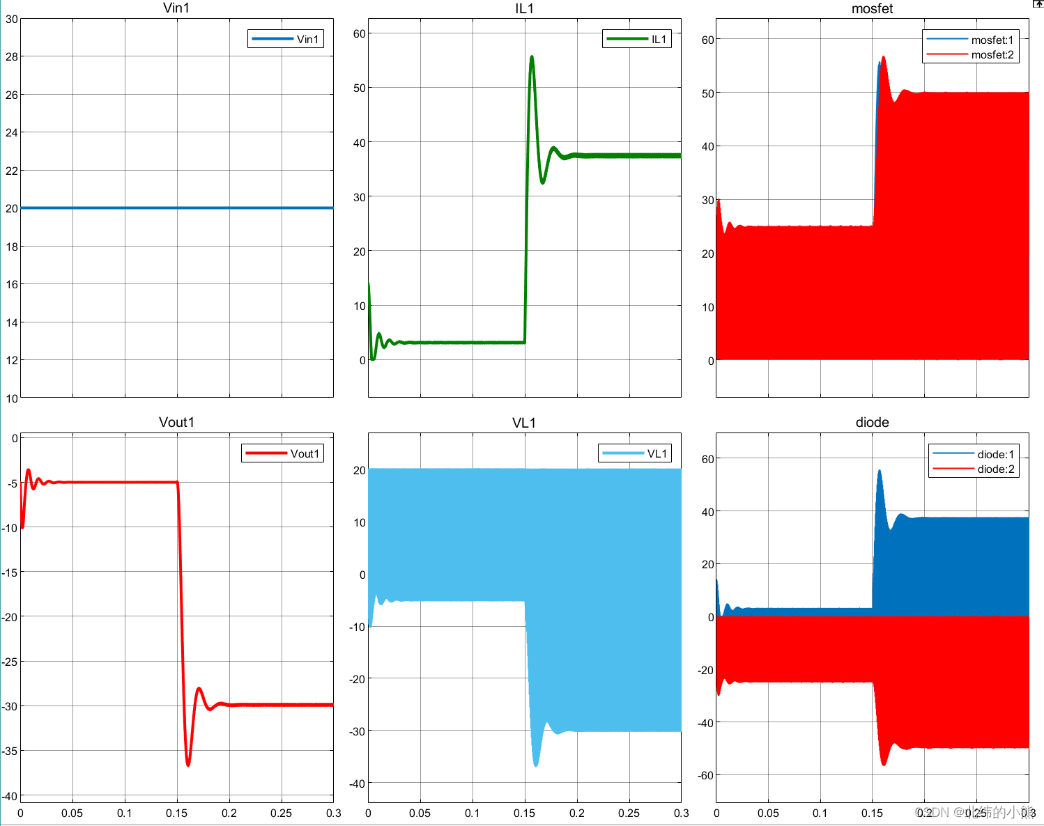 在0.15s时,占空比由0.2切换为0.6,输出波形如下所示,分别为输入电压、电感电流、MOSFET电压电流、输出电压、电压电压、二极管电压电流(从左到右、从上到下)