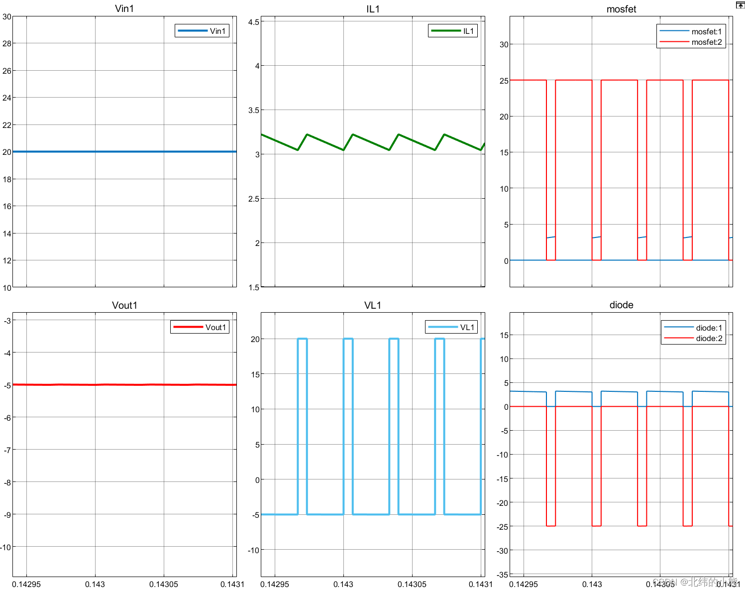 占空比设置为0.2,输出波形如下所示,分别为输入电压、电感电流、MOSFET电压电流、输出电压、电压电压、二极管电压电流(从左到右、从上到下)