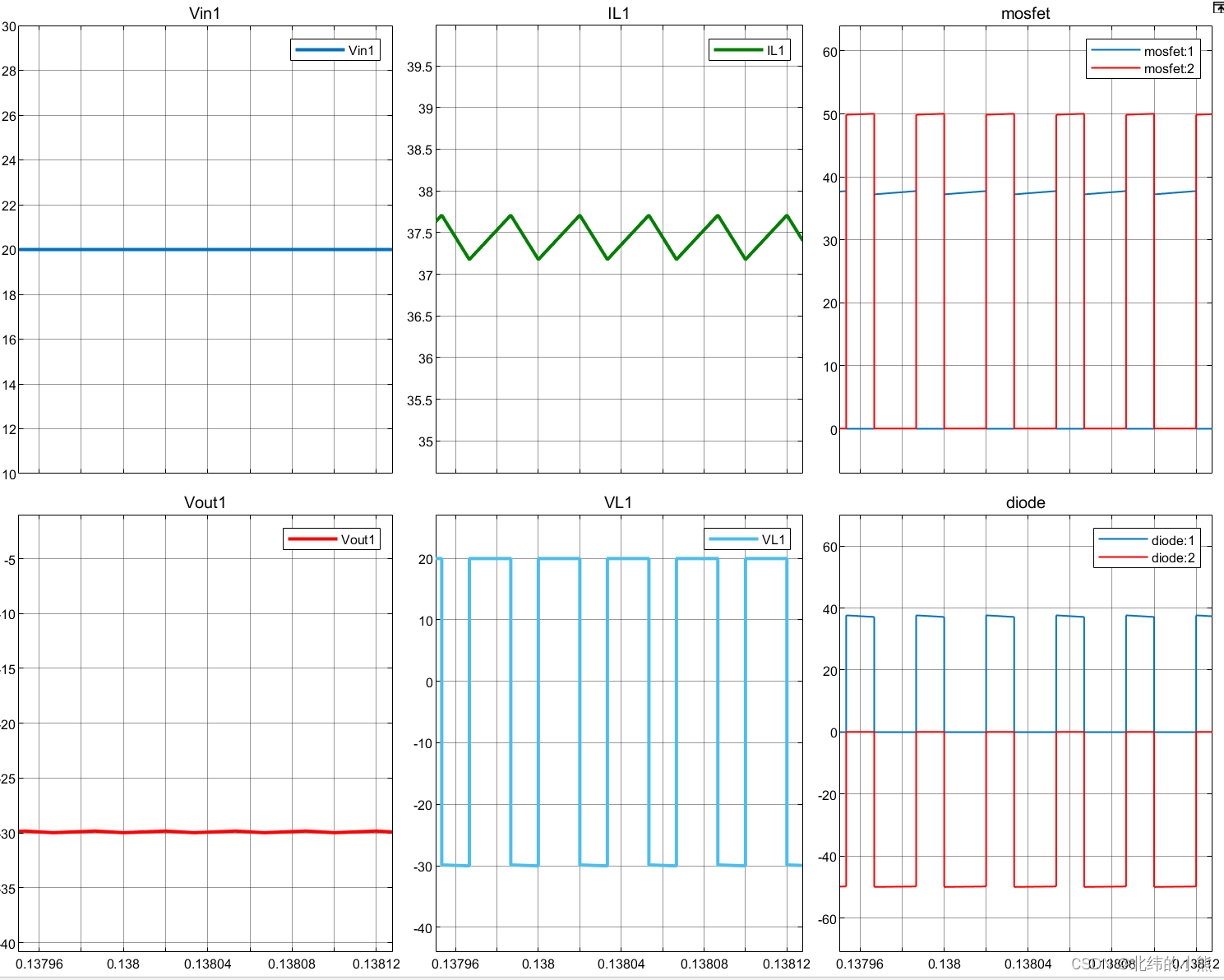 占空比设置为0.6,输出波形如下所示,分别为输入电压、电感电流、MOSFET电压电流、输出电压、电压电压、二极管电压电流(从左到右、从上到下)
