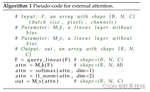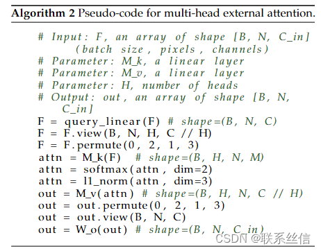 # from: https://github.com/MenghaoGuo/EANet/blob/main/multi_head_attention_torch.py class Attention(nn.Module): def __init__(self, dim, num_heads=8, qkv_bias=False, qk_scale=None, attn_drop=0., proj_drop=0.): super().__init__() self.num_heads = num_heads assert dim % num_heads == 0 self.coef = 4 self.trans_dims = nn.Linear(dim, dim * self.coef) self.num_heads = self.num_heads * self.coef self.k = 256 // self.coef self.linear_0 = nn.Linear(dim * self.coef // self.num_heads, self.k) self.linear_1 = nn.Linear(self.k, dim * self.coef // self.num_heads) self.attn_drop = nn.Dropout(attn_drop) self.proj = nn.Linear(dim * self.coef, dim) self.proj_drop = nn.Dropout(proj_drop) def forward(self, x): B, N, C = x.shape x = self.trans_dims(x) # B, N, C x = x.view(B, N, self.num_heads, -1).permute(0, 2, 1, 3) attn = self.linear_0(x) attn = attn.softmax(dim=-2) attn = attn / (1e-9 + attn.sum(dim=-1, keepdim=True)) attn = self.attn_drop(attn) x = self.linear_1(attn).permute(0,2,1,3).reshape(B, N, -1) x = self.proj(x) x = self.proj_drop(x) return x一个集成 模块的代码仓库的代码(非官方):