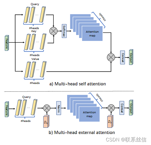 # from: https://github.com/MenghaoGuo/EANet/blob/main/model_torch.py class External_attention(nn.Module): ''' Arguments: c (int): The input and output channel number. ''' def __init__(self, c): super(External_attention, self).__init__() self.conv1 = nn.Conv2d(c, c, 1) self.k = 64 self.linear_0 = nn.Conv1d(c, self.k, 1, bias=False) self.linear_1 = nn.Conv1d(self.k, c, 1, bias=False) self.linear_1.weight.data = self.linear_0.weight.data.permute(1, 0, 2) self.conv2 = nn.Sequential( nn.Conv2d(c, c, 1, bias=False), norm_layer(c)) for m in self.modules(): if isinstance(m, nn.Conv2d): n = m.kernel_size[0] * m.kernel_size[1] * m.out_channels m.weight.data.normal_(0, math.sqrt(2. / n)) elif isinstance(m, nn.Conv1d): n = m.kernel_size[0] * m.out_channels m.weight.data.normal_(0, math.sqrt(2. / n)) elif isinstance(m, _BatchNorm): m.weight.data.fill_(1) if m.bias is not None: m.bias.data.zero_() def forward(self, x): idn = x x = self.conv1(x) b, c, h, w = x.size() n = h*w x = x.view(b, c, h*w) # b * c * n attn = self.linear_0(x) # b, k, n attn = F.softmax(attn, dim=-1) # b, k, n attn = attn / (1e-9 + attn.sum(dim=1, keepdim=True)) # # b, k, n x = self.linear_1(attn) # b, c, n x = x.view(b, c, h, w) x = self.conv2(x) x = x + idn x = F.relu(x) return x实现多头 注意力: