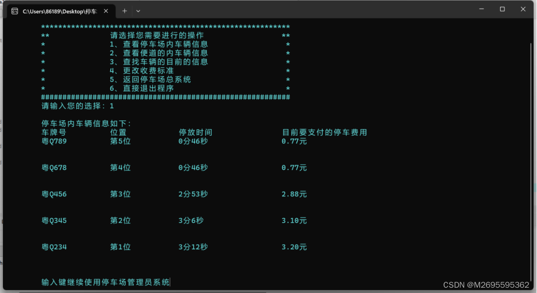 ①查看停车场内车辆信息,输出该停车场所有车辆的车牌号、位序、进入时间和消费金额;