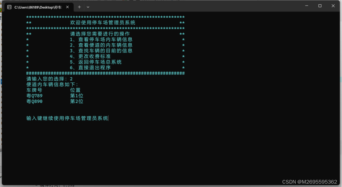 ②查看停车场便道内车辆信息,输出该停车场便道内车辆的车牌号和位序;