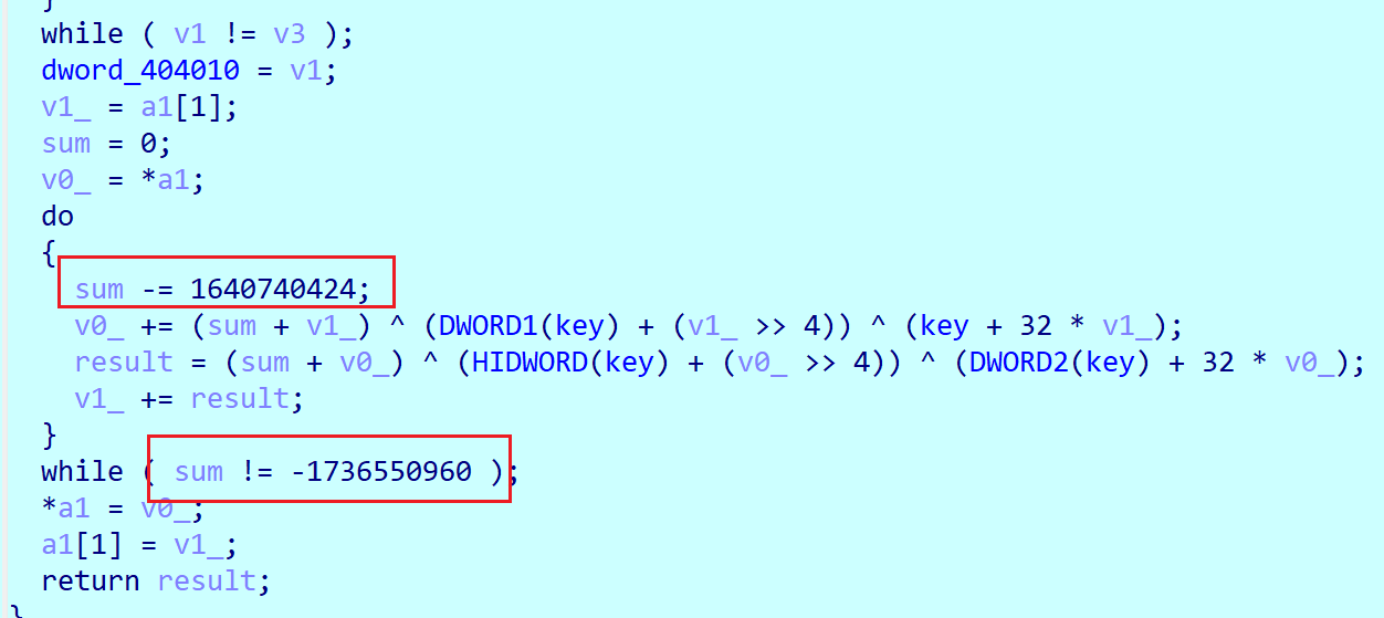 v1.value -= ( (v0.value*32) + k[2] )^(v0.value + sum1.value)^( (v0.value >> 4) + k[3] )