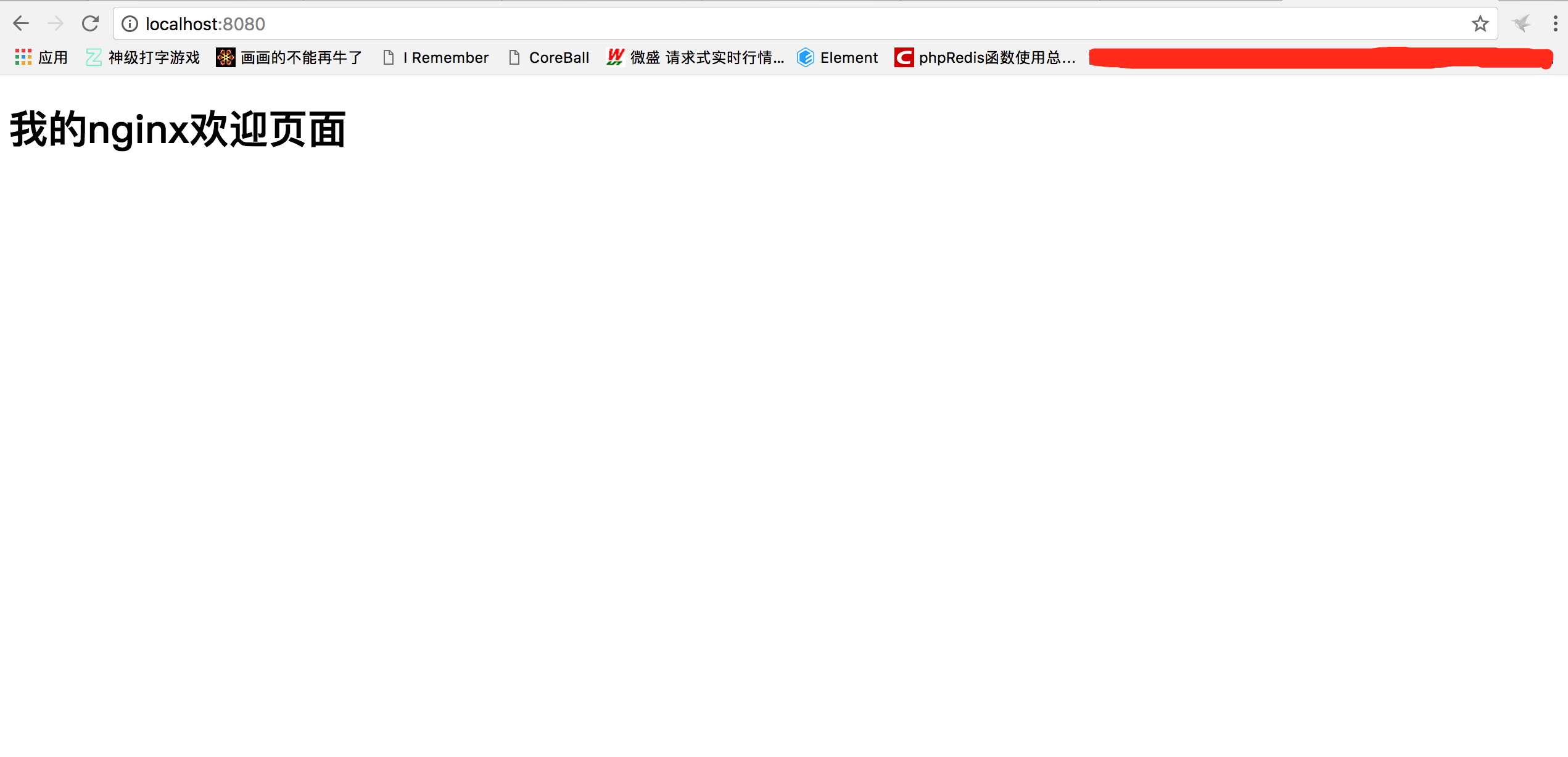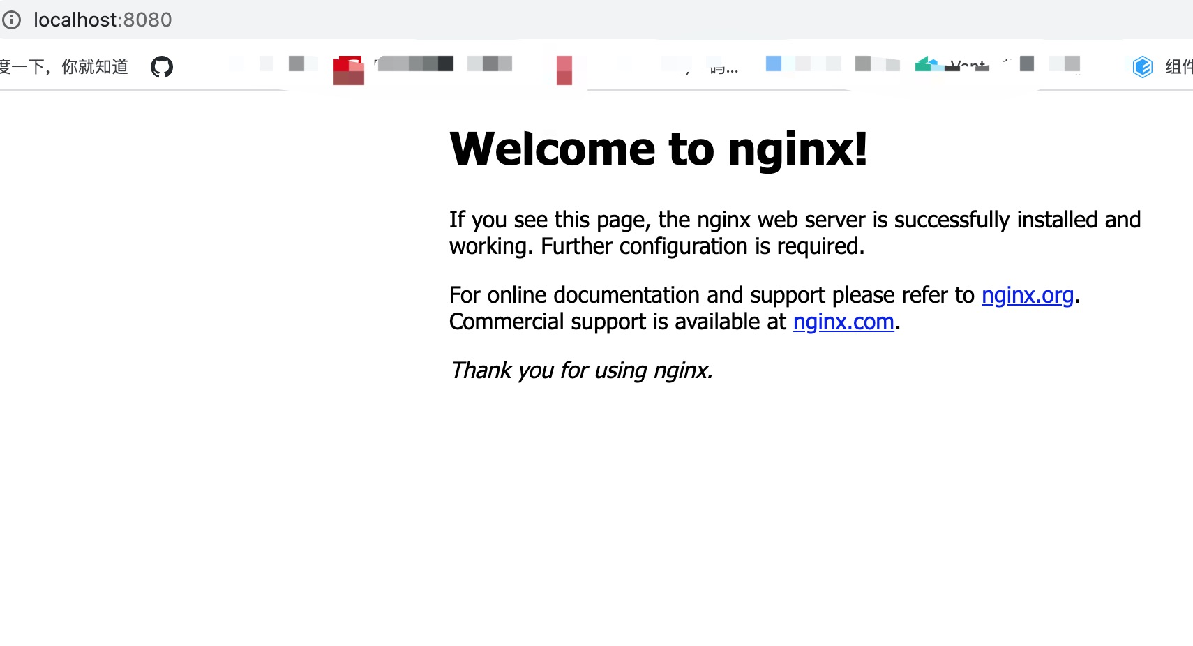 打开浏览器访问localhost:8080,这里跟网上的一些教程会有些不一样,正常情况下到这一步就会能看到nginx的欢迎界面啦。
