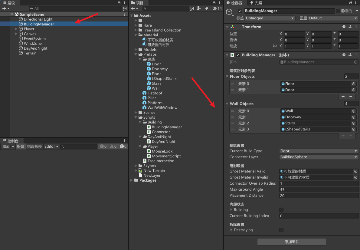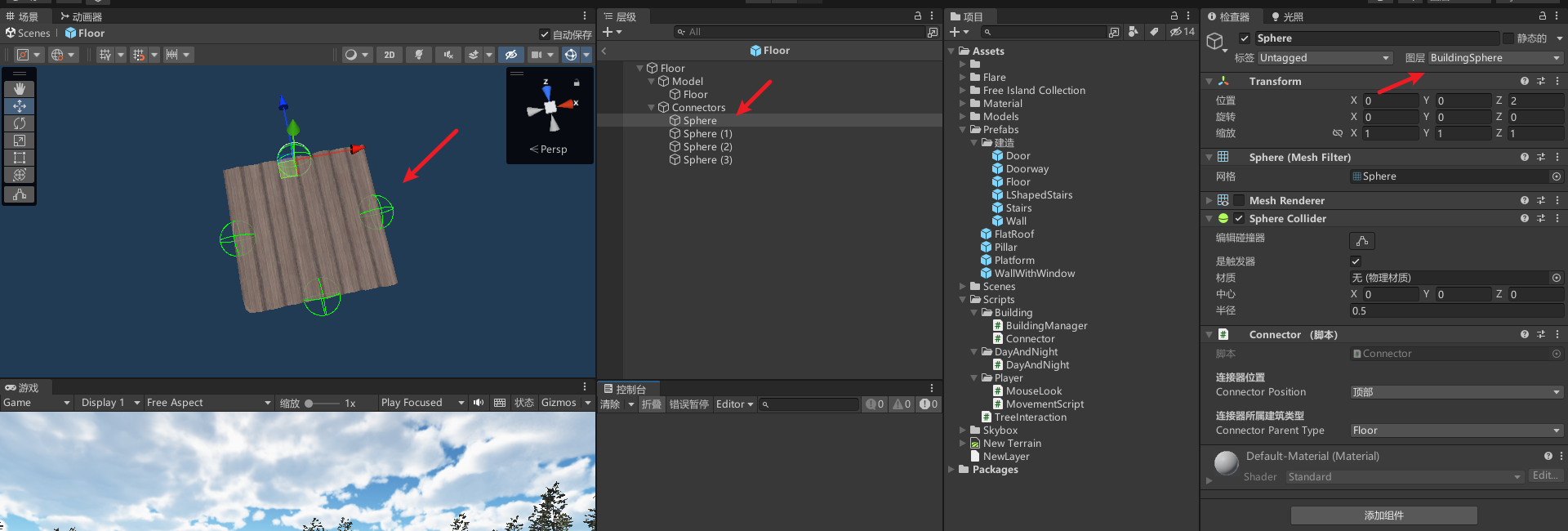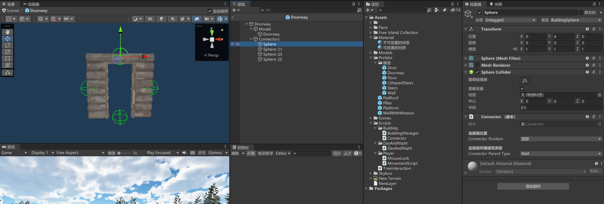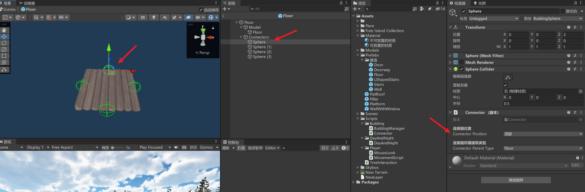 public class Connector : MonoBehaviour { [Header("连接器位置")] public ConnectorPosition connectorPosition; [Header("连接器所属建筑类型")] public SelectedBuildType connectorParentType; [Header("是否可以连接地面")] private bool canConnectToFloor = true; [Header("是否可以连接墙壁")] private bool canConnectToWall = true; [HideInInspector] public bool isConnectedToFloor = false; // 是否连接到地面 [HideInInspector] public bool isConnectedToWall = false; // 是否连接到墙壁 [HideInInspector] public bool canConnectTo = true; // 是否可以连接其他建筑 //在场景中绘制连接器的可视化表示 private void OnDrawGizmos() { // 根据 canConnectTo 变量设置颜色 Gizmos.color = isConnectedToFloor ? (isConnectedToFloor ? Color.red : Color.blue) : (!isConnectedToWall ? Color.green : Color.yellow); // 在连接器位置绘制一个圆形表示连接状态 Gizmos.DrawWireSphere(transform.position, transform.lossyScale.x / 2f); } // 更新连接器和附近的其他连接器的连接状态 public void updateConnectors(bool rootCall = false) { Collider[] colliders = Physics.OverlapSphere(transform.position, transform.lossyScale.x / 2f); // 获取连接范围内的所有碰撞体 isConnectedToFloor = !canConnectToFloor; isConnectedToWall = !canConnectToWall; foreach (Collider collider in colliders) { // 忽略自身的碰撞体 if (collider.GetInstanceID() == GetComponent().GetInstanceID()) { continue; } //忽略处于非激活状态的碰撞体 if (!collider.gameObject.activeInHierarchy) { continue; } if (collider.gameObject.layer == gameObject.layer) { // 获取相邻连接器的信息 Connector foundConnector = collider.GetComponent(); if(!foundConnector) continue; // 如果相邻连接器是地面连接器,则更新 isConnectedToFloor 为 true if (foundConnector.connectorParentType == SelectedBuildType.floor) isConnectedToFloor = true; // 如果相邻连接器是墙壁连接器,则更新 isConnectedToWall 为 true if (foundConnector.connectorParentType == SelectedBuildType.wall) isConnectedToWall = true; // 如果是根调用,则继续递归更新相邻连接器的状态 if (rootCall) foundConnector.updateConnectors(); } } // 根据连接状态更新 canConnectTo 的值 canConnectTo = true; if (isConnectedToFloor && isConnectedToWall) { canConnectTo = false; } } } // 连接器位置枚举 [System.Serializable] public enum ConnectorPosition { left, // 左侧 right, // 右侧 top, // 顶部 bottom // 底部 }配置,注意xyz轴朝向不要弄错了,以此来定连接器位置