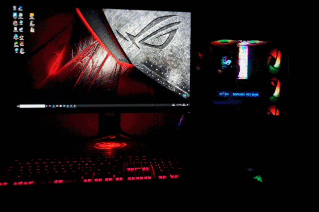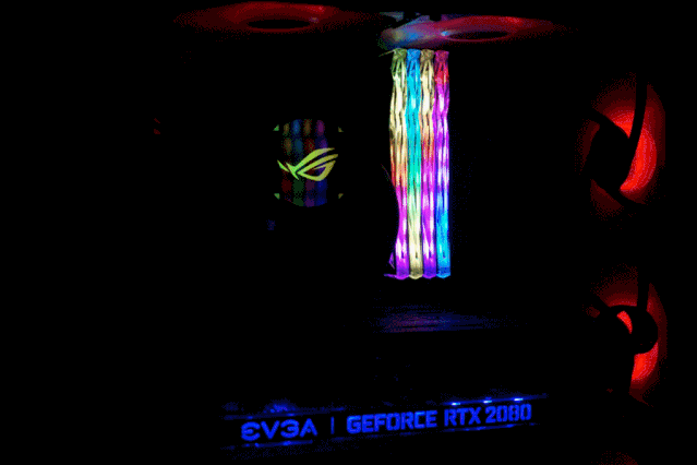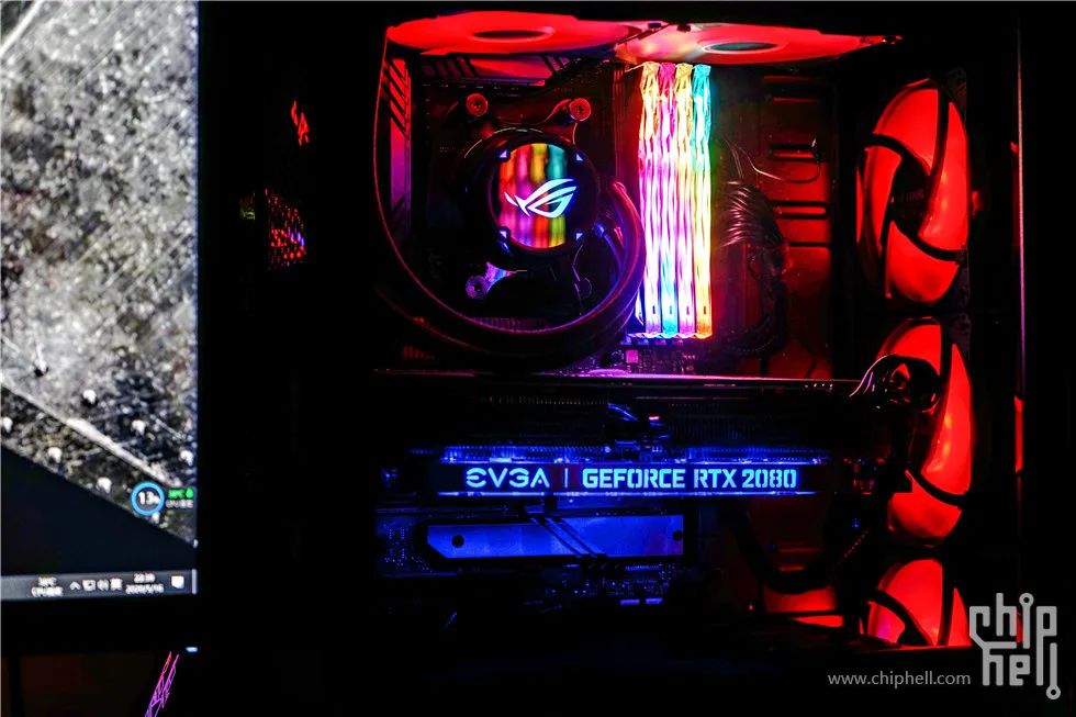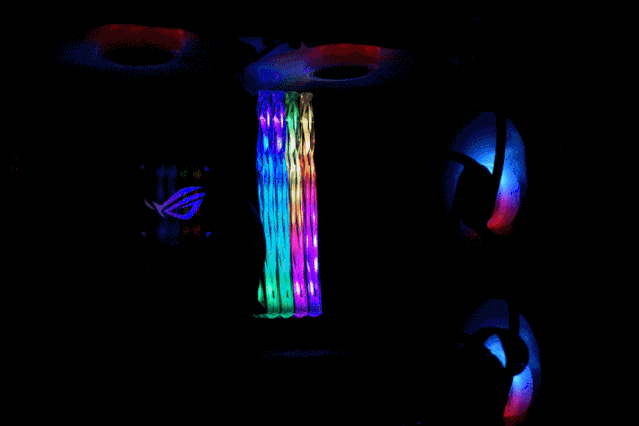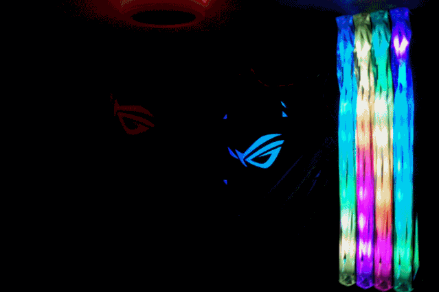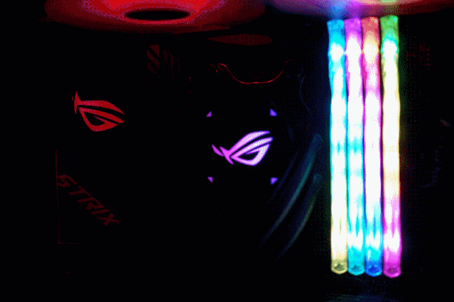 在一定角度下,星耀内存的灯条会映射到ROG STRIX LC 240的水冷镜头上,效果更好。 由于整机主要采用ROG和TUF GAMING配件,所以朋友选择了GT301大风扇红常亮,而星耀内存和水块则动态变色,可以通过Armoury Crate直接控制。