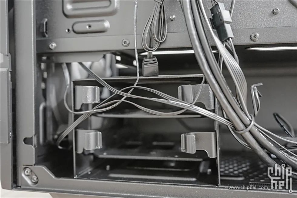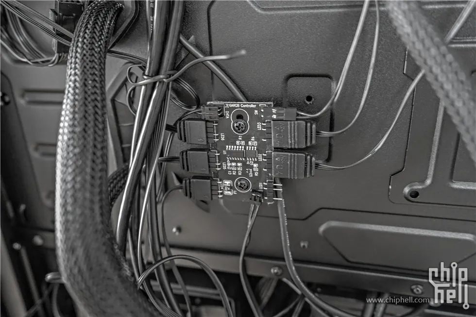 GT301机箱背面,主要线材均已通过绑带固定,并贴心设计了灯效中控系统,支持5V3pin灯效控制,有6个端口,使用Sata口供电,或者通过灯机箱效果开关直接控制灯光效果。 机箱前面板上的风扇已经占了3个,出厂前就已经接好了。 稍后我将直接将 STRIX LC 240 的两个风扇连接到此控制上,并详细介绍安装部分。