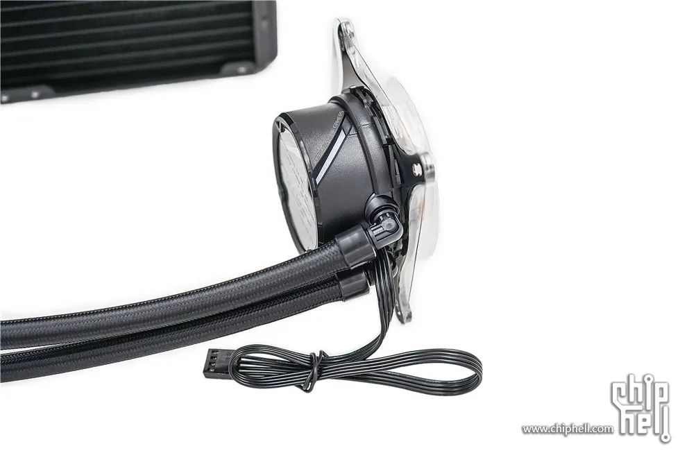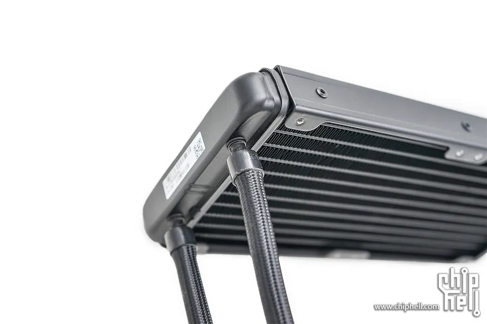 水冷管与散热器连接处特写,水冷管有编织网保护。