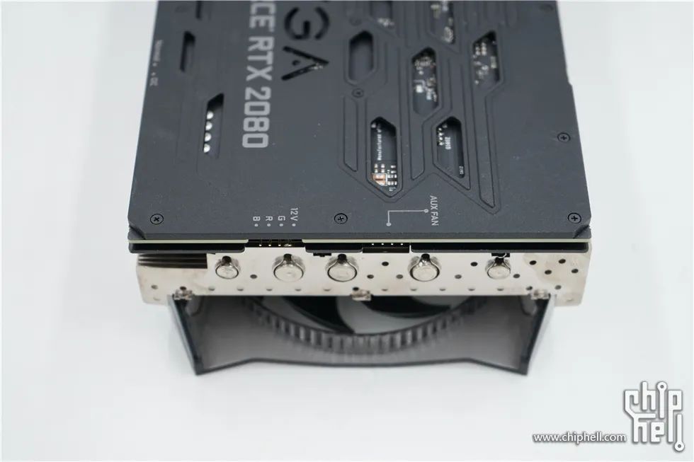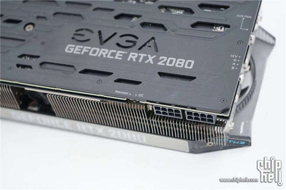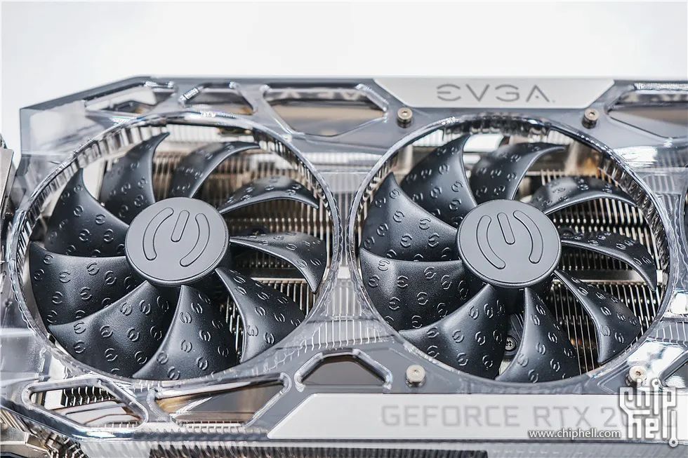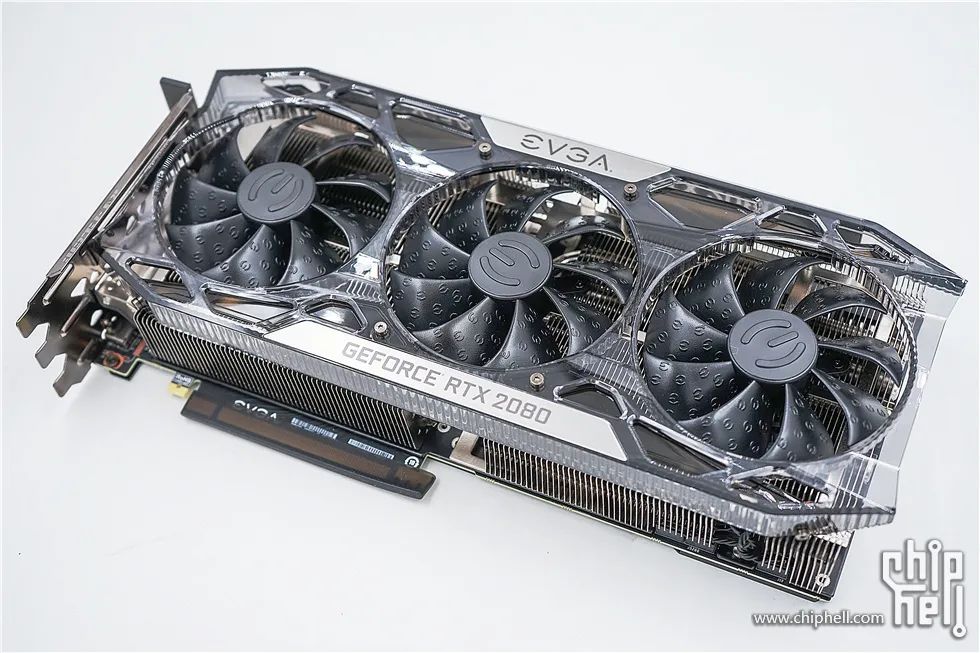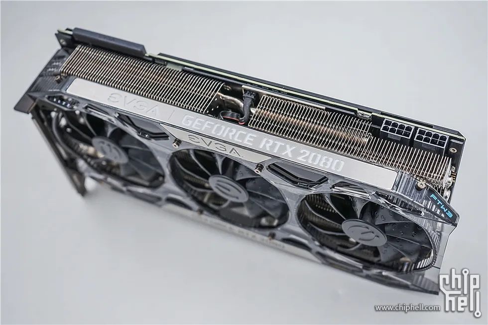 EVGA GeForce RTX 2080 FTW3 GAMING显卡的外壳采用透明设计,隐约可以看到底部布满了密集的散热片。 感觉。
