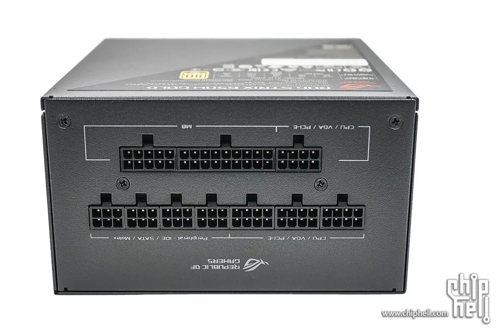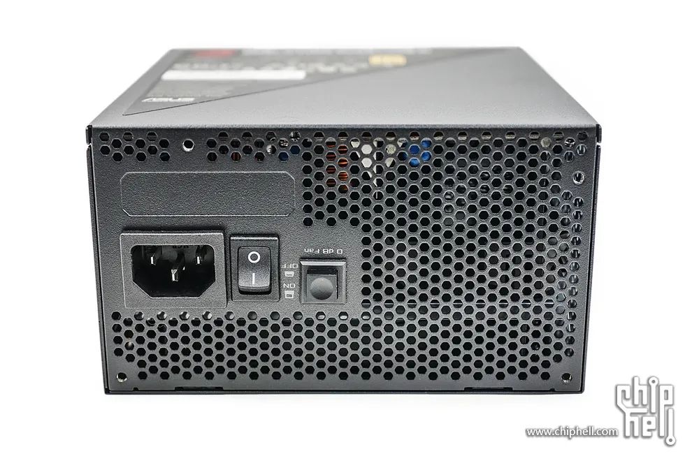电源接口部分,除了常规的电源接口和开关外,还多了一个零噪声开关。 官网介绍,Axial-Tech轴流风扇与ROG散热模块的结合,可以在40%负载下实现90%以上的零噪音输出负载。 ,噪声值可控制在25dB以下。 实际使用中,与其他风扇的声音相比,完全感觉不到电源风扇的声音。 电源接口上方的空间预留了瓷砖,这也是雷鹰电源的设计特色,并且可以通过瓷砖定制电源的外观。